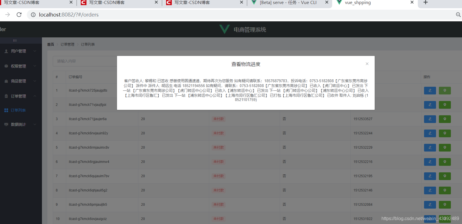 <template><div><!-- 面包屑导航区 --><el-breadcrumb separator-class="el-icon-arrow-right"><el-breadcrumb-item :to="{ path: '/home' }">首页</el-breadcrumb-item><el-breadcrumb-item>订单管理</el-breadcrumb-item><el-breadcrumb-item>订单列表</el-breadcrumb-item></el-breadcrumb><!-- 卡片视图 --><el-card><el-row><el-col :span="6"><el-input placeholder="请输入内容"><el-button slot="append" icon="el-icon-search"></el-button></el-input></el-col></el-row><!-- 订单列表 --><el-table :data="orderList" border stripe><el-table-column type="index" label="#"></el-table-column><el-table-column label="订单编号" prop="order_number"></el-table-column><el-table-column label="订单价格" prop="order_price"></el-table-column><el-table-column label="是否付款"><template slot-scope="scope"><el-tag type="danger" size="mini" v-if="scope.row.pay_status">未付款</el-tag><el-tag type="success" size="mini" v-else>已付款</el-tag></template></el-table-column><el-table-column label="是否发货" prop="is_send"></el-table-column><el-table-column label="下单时间" prop="create_time"></el-table-column><el-table-column label="操作"><template slot><el-button type="primary" size="mini" icon="el-icon-edit" @click="showEditDialog"></el-button><el-buttontype="success"size="mini"icon="el-icon-location"@click="showProgressDialog"></el-button></template></el-table-column></el-table><!-- 分页区域 --><el-pagination@size-change="handleSizeChange"@current-change="handleCurrentChange":current-page="queryInfo.pagenum":page-sizes="[5, 10, 15, 20]":page-size="queryInfo.pagesize"layout="total, sizes, prev, pager, next, jumper":total="total"></el-pagination></el-card><!-- 编辑对话框 --><el-dialogtitle="修改地址":visible.sync="addressDialogVisible"width="50%"@close="addressDialogClosed"><el-form:model="addressForm":rules="addressFormRules"ref="addressFormRef"label-width="100px"><el-form-item label="省市区/县" prop="address1"><el-cascaderv-model="addressForm.address1":options="cityData":props="{ expandTrigger: 'hover' }"></el-cascader></el-form-item><el-form-item label="详细地址" prop="address2"><el-input v-model="addressForm.address2"></el-input></el-form-item></el-form><span slot="footer" class="dialog-footer"><el-button @click="addressDialogVisible = false">取 消</el-button><el-button type="primary" @click="dialogVisible = false">确 定</el-button></span></el-dialog><!-- 展示物流进度对话框 --><el-dialog title="查看物流进度" :visible.sync="progressDialogVisible" width="50%"><!-- 时间线 --><el-timeline><el-timeline-itemv-for="(activity, index) in progressInfo":key="index":timestamp="activity.time">{{activity.context}}</el-timeline-item></el-timeline></el-dialog></div>