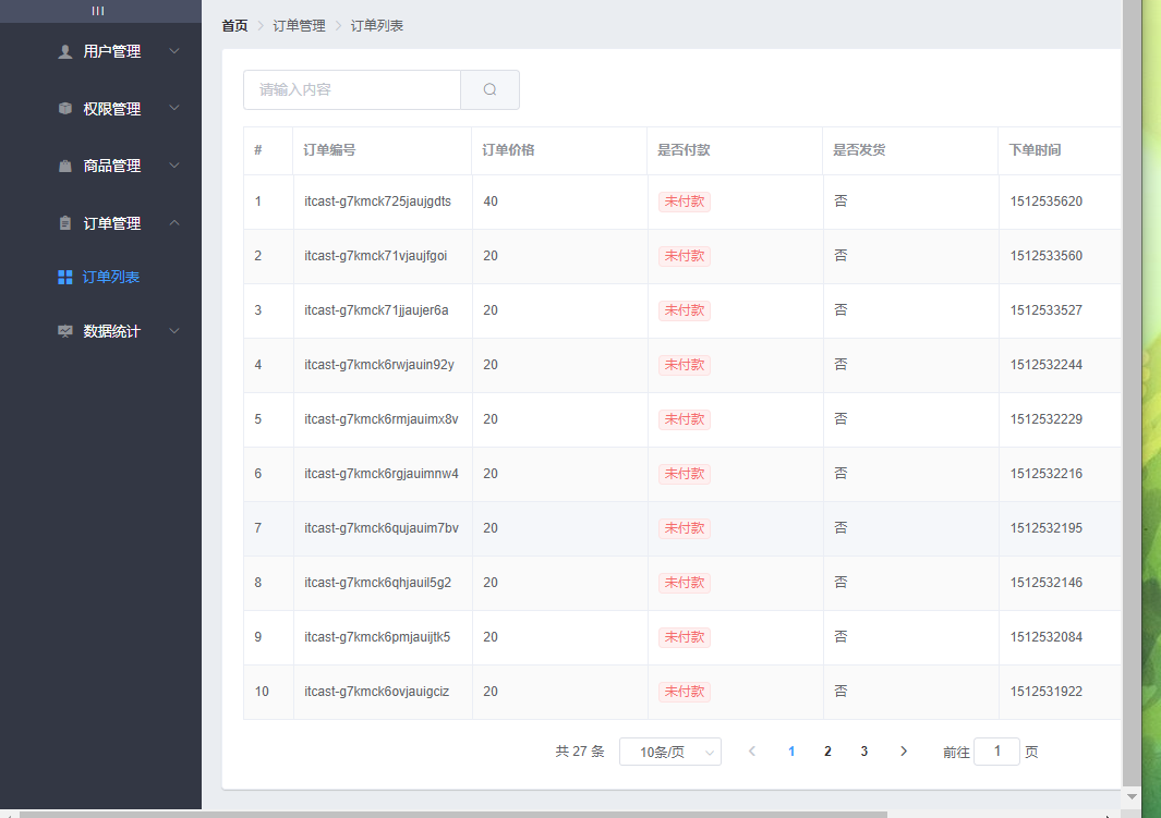 <!-- 订单列表 --><el-table :data="orderList" border stripe><el-table-column type="index" label="#"></el-table-column><el-table-column label="订单编号" prop="order_number"></el-table-column><el-table-column label="订单价格" prop="order_price"></el-table-column><el-table-column label="是否付款"><template slot-scope="scope"><el-tag type="danger" size="mini" v-if="scope.row.pay_status">未付款</el-tag><el-tag type="success" size="mini" v-else>已付款</el-tag></template></el-table-column><el-table-column label="是否发货" prop="is_send"></el-table-column><el-table-column label="下单时间" prop="create_time"></el-table-column><el-table-column label="操作"><template slot><el-button type="primary" size="mini" icon="el-icon-edit" @click="showEditDialog"></el-button><el-buttontype="success"size="mini"icon="el-icon-location"@click="showProgressDialog"></el-button></template></el-table-column></el-table><!-- 分页区域 --><el-pagination@size-change="handleSizeChange"@current-change="handleCurrentChange":current-page="queryInfo.pagenum":page-sizes="[5, 10, 15, 20]":page-size="queryInfo.pagesize"layout="total, sizes, prev, pager, next, jumper":total="total"></el-pagination></el-card></div>