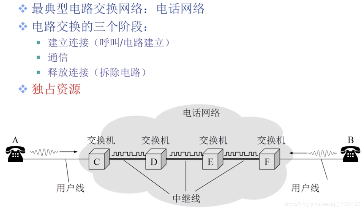 特点:独占资源:一旦电路建立,通信时所占用的电路资源(如信道资源),不能被第三方共用。