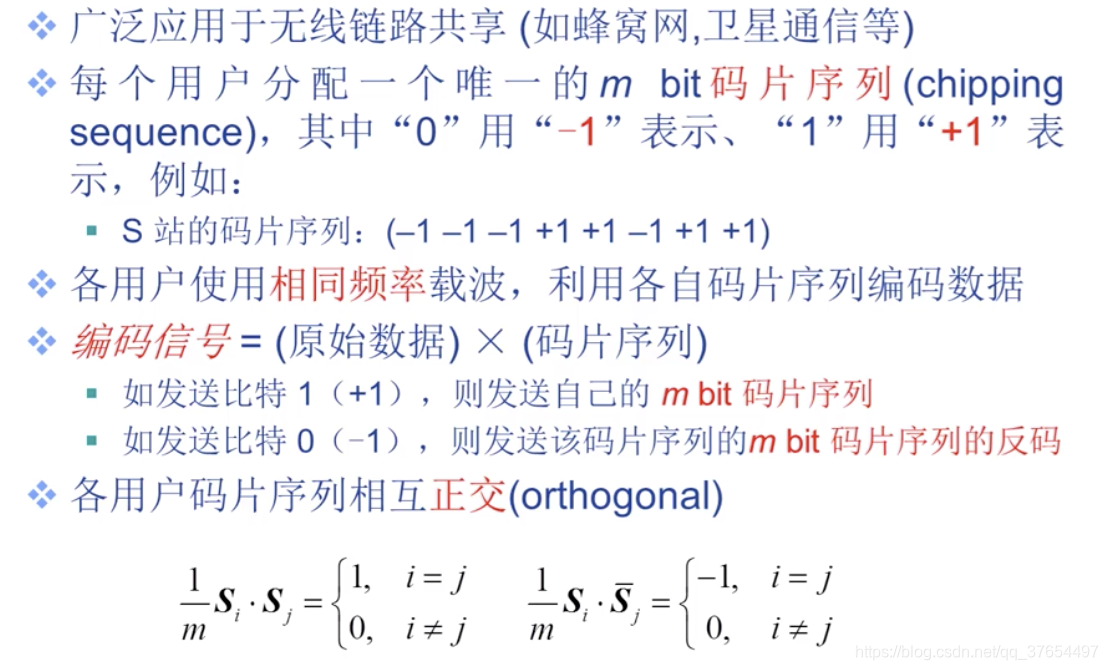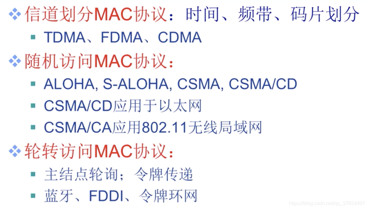 ⚫ 信道划分协议:时分多路复用、频分多路复用以及码分多址(给每个节 点分配不同 编码,实现不同节点能同时传输,不会相互干扰) 缺点:传输速率只能是 R/M;即使只有一个节点要传输,它也只能占用自己的信道。