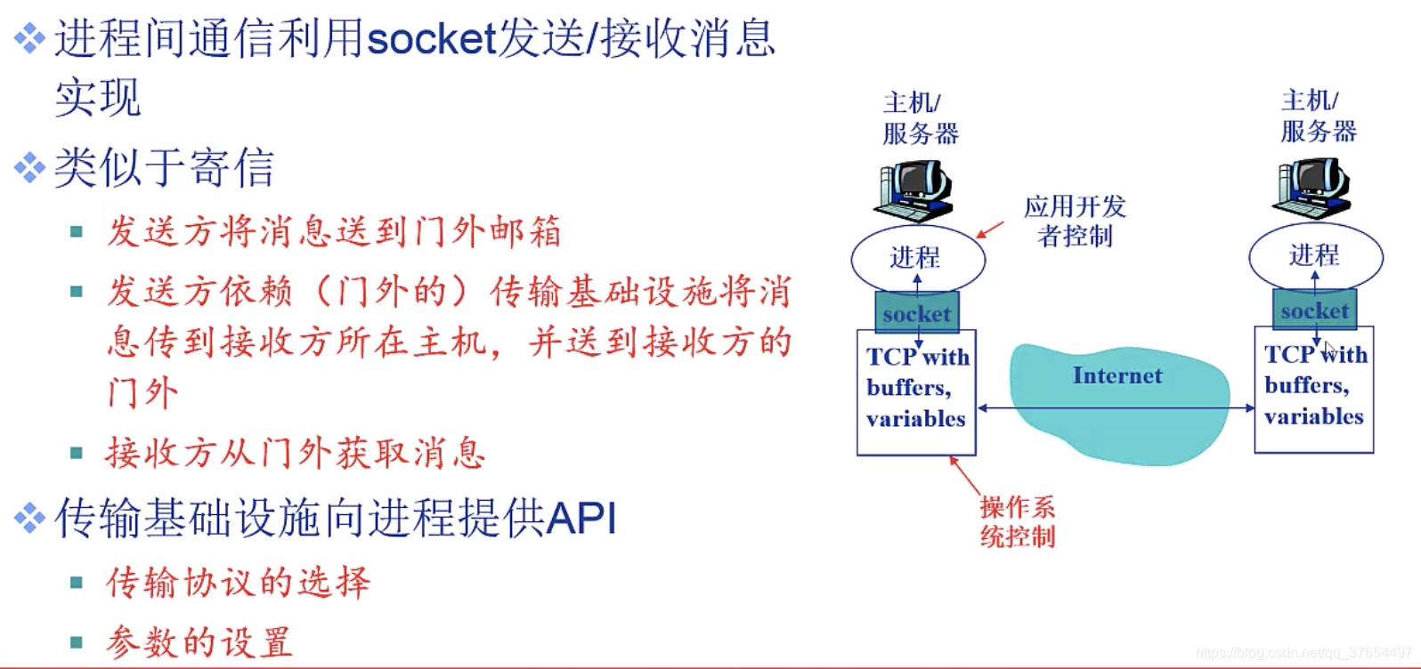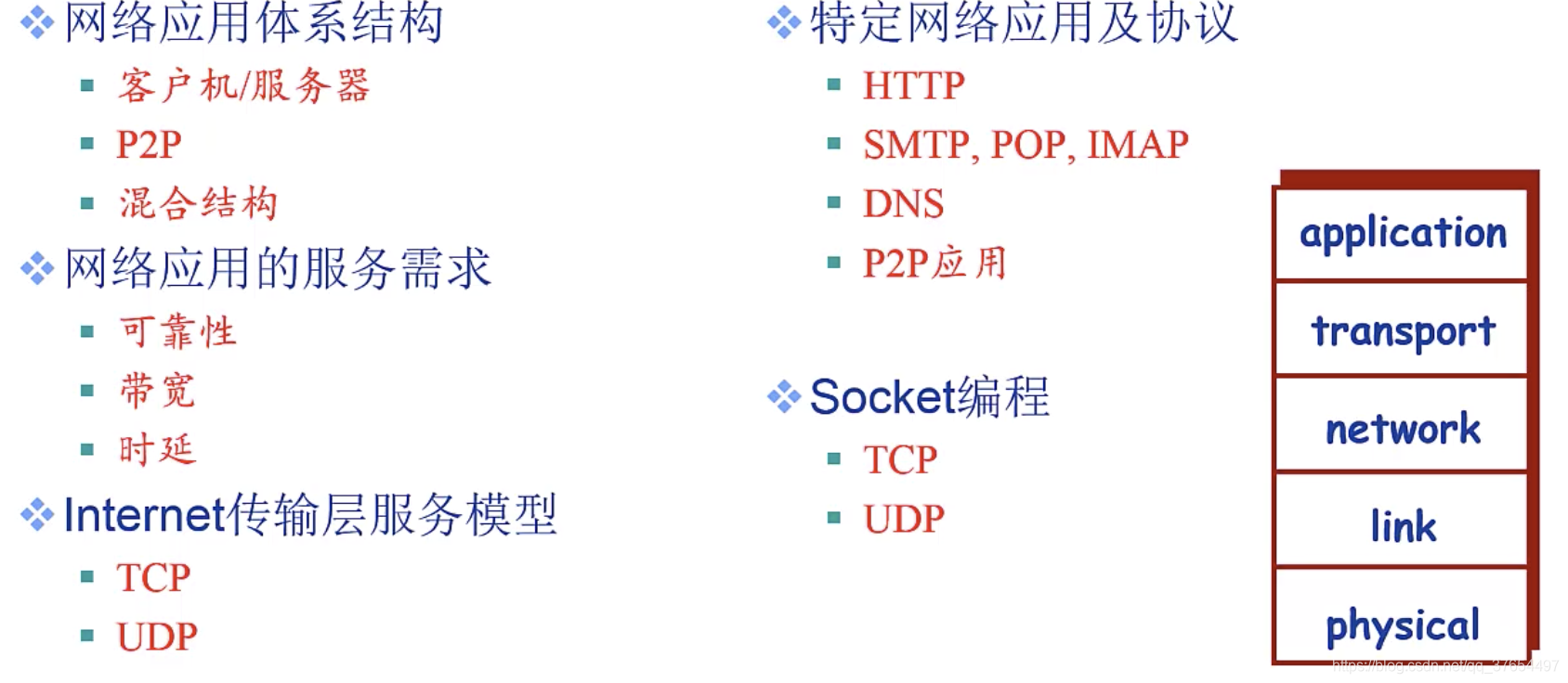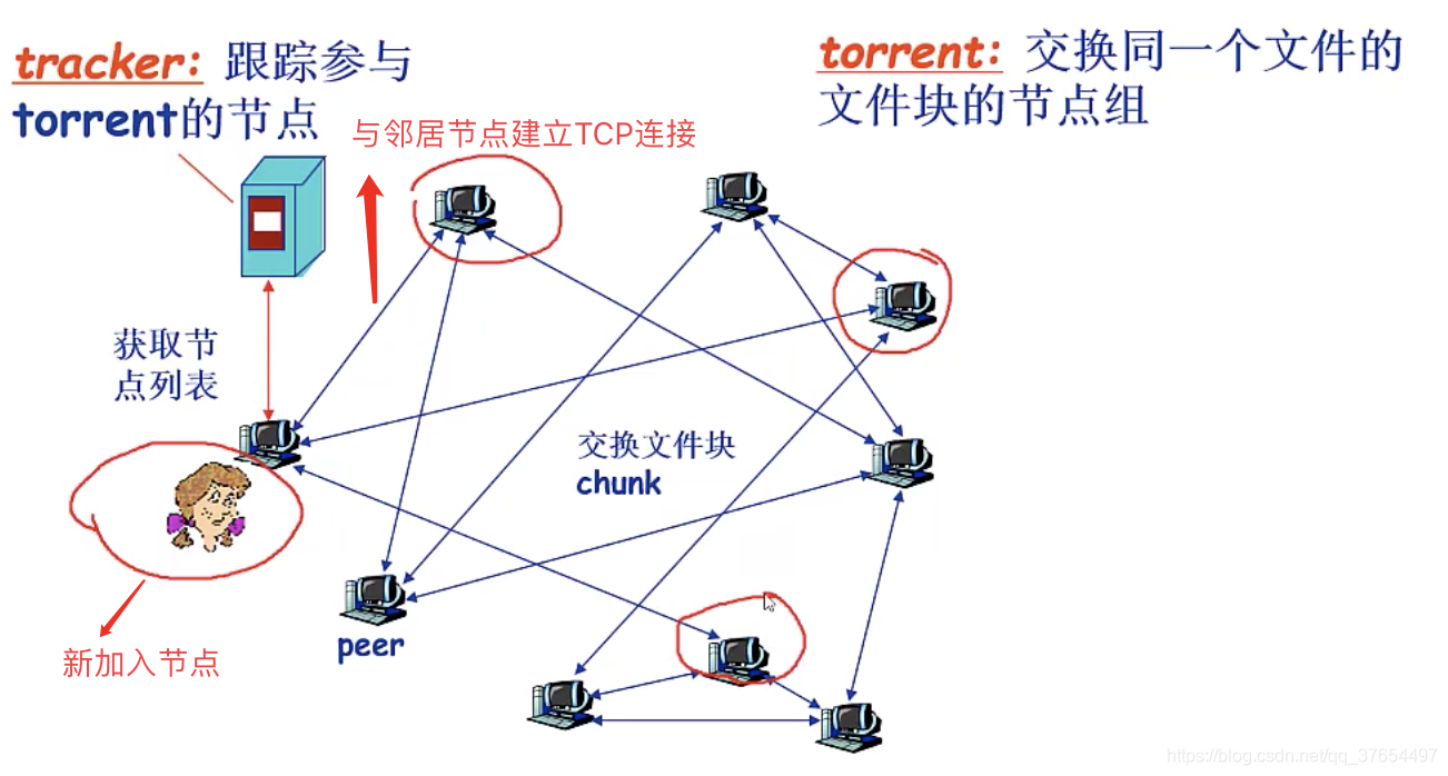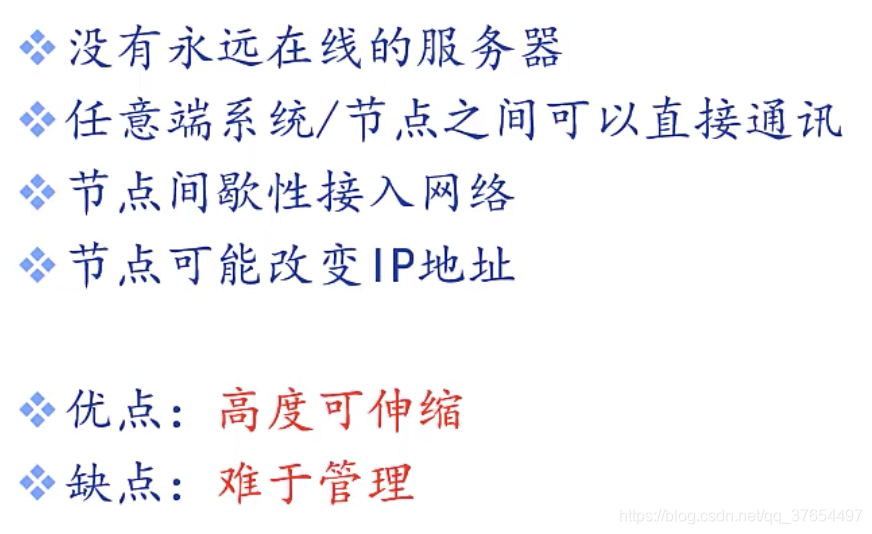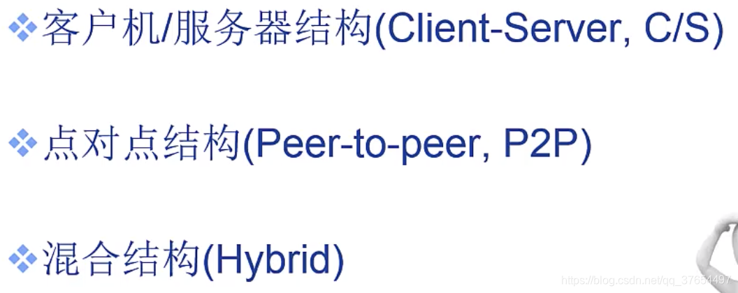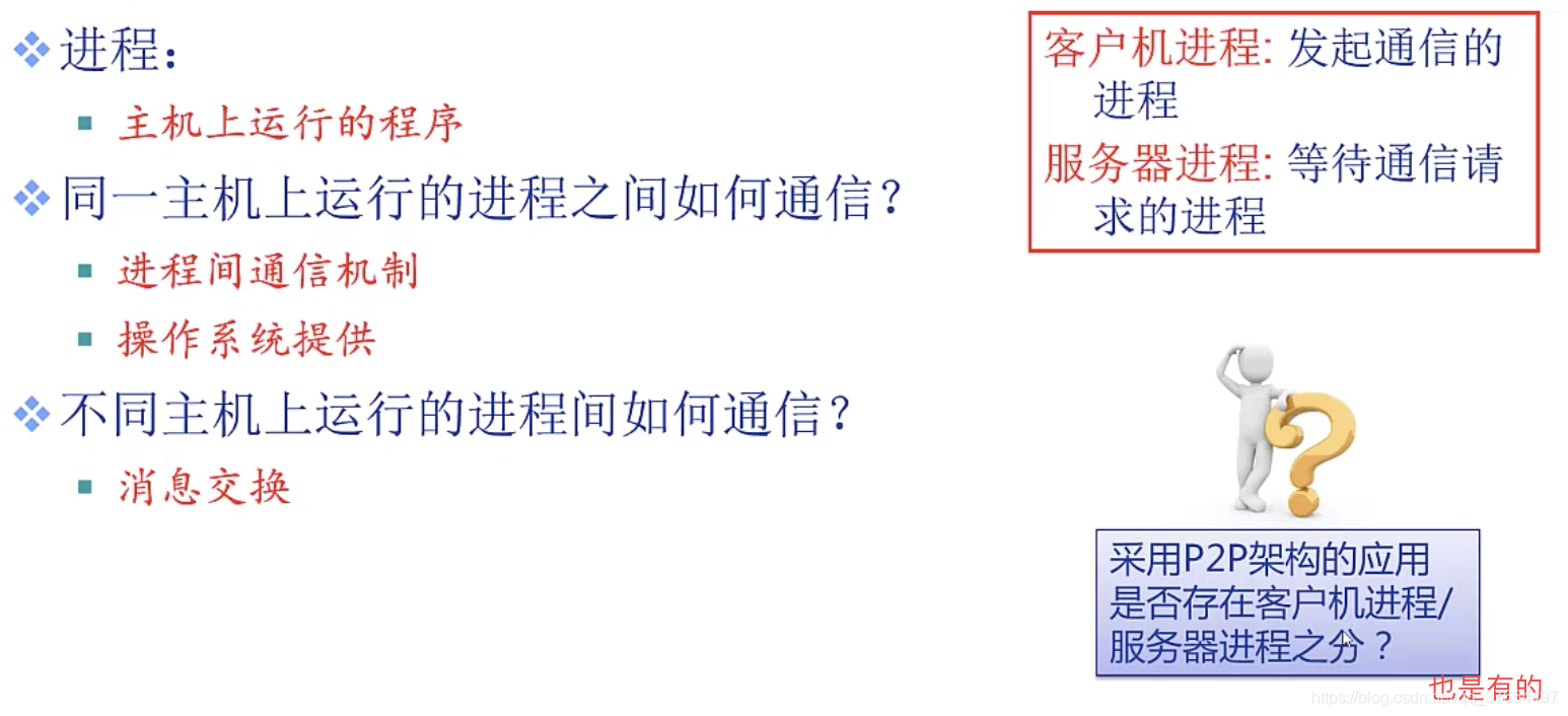 对等应用模型(p2p):无(或不依赖)专用服务器,通信在对等实体之间直接进行。 如skype,qq等。