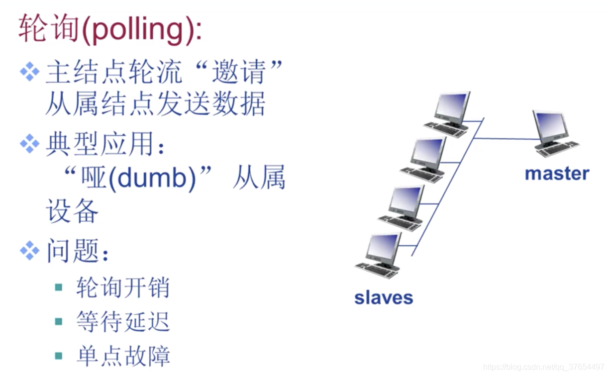 轮询协议:一个主节点一次把令牌发下去,询问其它节点,并给出最大数量帧(防止一个节点占用时间过长)。缺点是有轮询延迟:即使只有一个节点在传输,不能全速传输,因为主节点要在其传输完最大数量帧后轮询,轮询开销;而且一旦主节点出问题,整个信道不能用。