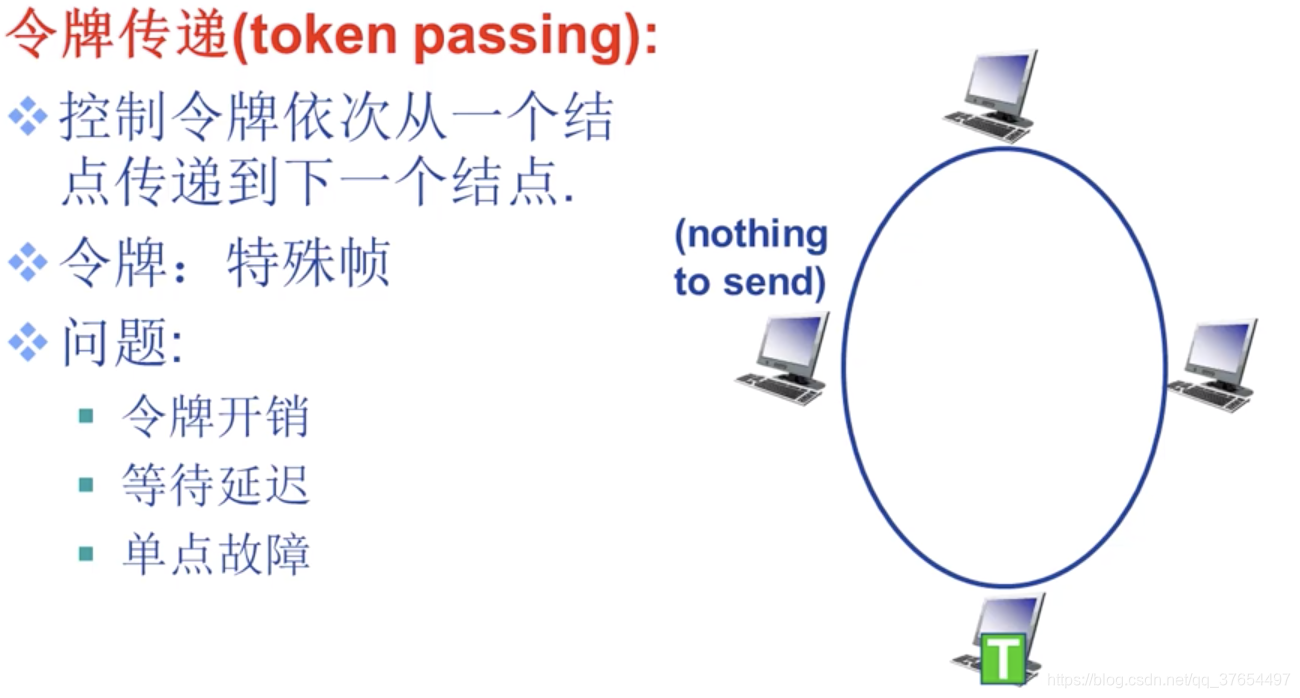 ⚫ 轮流协议:同一条广播链路上的节点以传递令牌的形式轮流获得传输的权利。如果得到令牌的节点没有东西要传,迅速传给下一个。