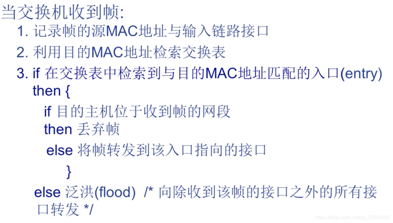 如果交换机表中没有目的地址,广播。如果收到的帧目的地址和源地址网段相同(连在同一个接口),说明两个主机可以直达,过滤。