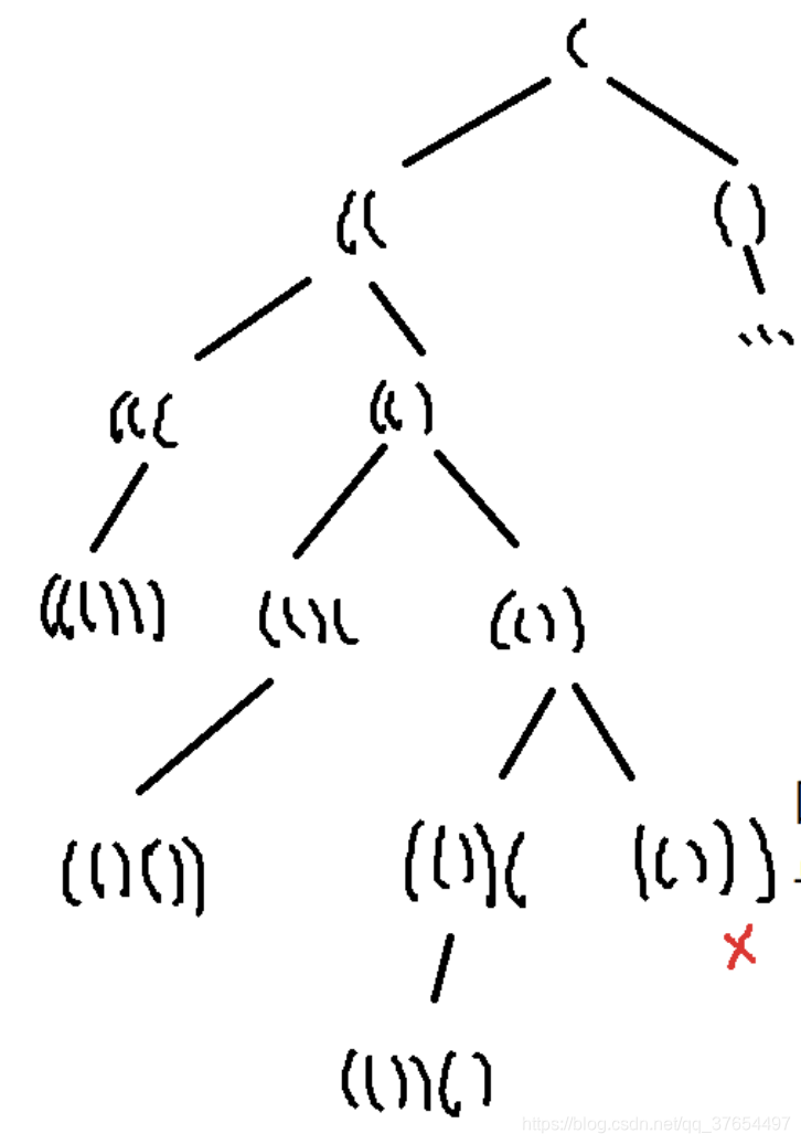 public List<String> generateParenthesis(int n) {List<String> res = new ArrayList<String>();back("",res,0,0,n);return res;}public void back(String str,List<String> list,int l,int r,int n){if(r==n)因为right是右括号,数量=n 表明此时已经找到一个结果list.add(str);if(l<n)back(str + "(" ,list,l+1,r,n);if(r<l)//右括号数一定小于等于左括号数,一旦超过则不匹配back(str + ")" ,list,l,r+1,n);}