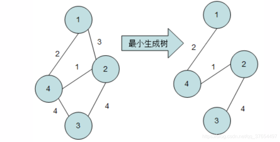 3.遍历完所有边后,原图上所有结点属于同一个集合则被选取的边和原图中 所有结点构成最小生成树;否则原图不连通,最小生成树不存在。