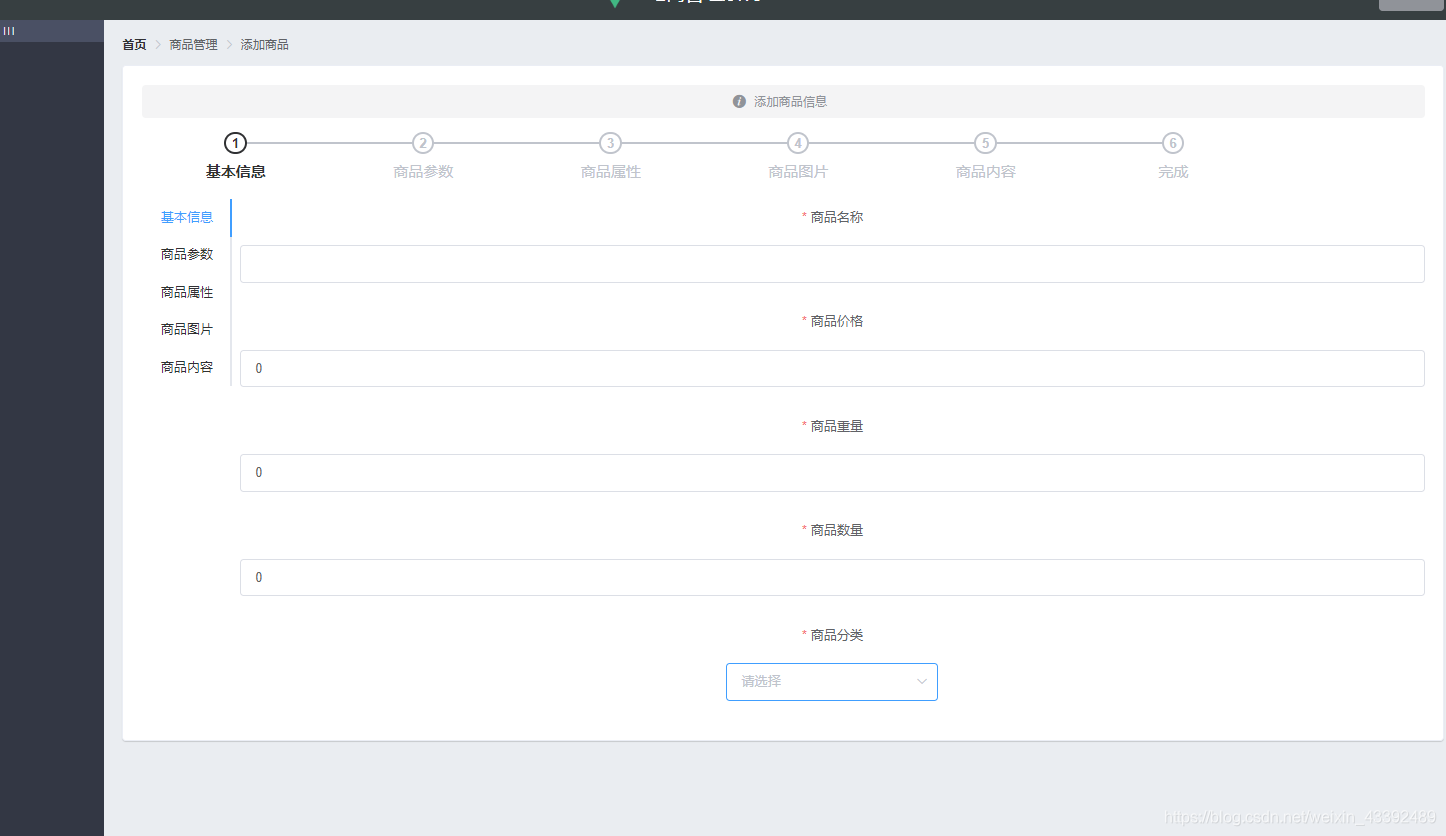 <div><!-- 面包屑导航区 --><el-breadcrumb separator-class="el-icon-arrow-right"><el-breadcrumb-item :to="{ path: '/home' }">首页</el-breadcrumb-item><el-breadcrumb-item>商品管理</el-breadcrumb-item><el-breadcrumb-item>添加商品</el-breadcrumb-item></el-breadcrumb><el-card><!-- 提示 --><el-alert title="添加商品信息" type="info" center show-icon :closable="false"></el-alert><!-- 步骤条 --><el-steps :space="200" :active="activeIndex-0" finish-status="success" align-center><el-step title="基本信息"></el-step><el-step title="商品参数"></el-step><el-step title="商品属性"></el-step><el-step title="商品图片"></el-step><el-step title="商品内容"></el-step><el-step title="完成"></el-step></el-steps><el-form:model="addForm":rules="addFormRules"ref="addFormRef"label-width="100px"label-position="top"><el-tabs v-model="activeIndex" :tab-position="'left'" ><el-tab-pane label="基本信息" name="0"><el-form-item label="商品名称" prop="goods_name"><el-input v-model="addForm.goods_name"></el-input></el-form-item><el-form-item label="商品价格" prop="goods_price"><el-input v-model="addForm.goods_price" type="number"></el-input></el-form-item><el-form-item label="商品重量" prop="goods_weight"><el-input v-model="addForm.goods_weight" type="number"></el-input></el-form-item><el-form-item label="商品数量" prop="goods_number"><el-input v-model="addForm.goods_number" type="number"></el-input></el-form-item><el-form-item label="商品分类" prop="goods_cat"><el-cascaderv-model="addForm.goods_cat":options="cateList":props="cascaderProps"@change="handleChange"></el-cascader></el-form-item></el-tab-pane><el-tab-pane label="商品参数" name="1">商品参数</el-tab-pane><el-tab-pane label="商品属性" name="2">商品属性</el-tab-pane><el-tab-pane label="商品图片" name="3">商品图片</el-tab-pane><el-tab-pane label="商品内容" name="4">商品内容</el-tab-pane></el-tabs></el-form></el-card></div>
