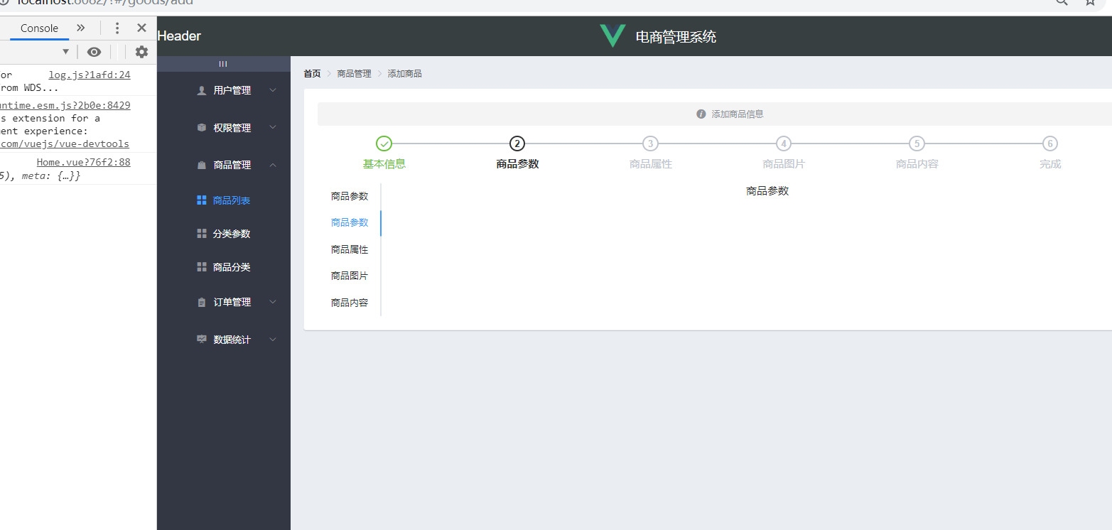 <div><!-- 面包屑导航区 --><el-breadcrumb separator-class="el-icon-arrow-right"><el-breadcrumb-item :to="{ path: '/home' }">首页</el-breadcrumb-item><el-breadcrumb-item>商品管理</el-breadcrumb-item><el-breadcrumb-item>添加商品</el-breadcrumb-item></el-breadcrumb><el-card><!-- 提示 --><el-alert title="添加商品信息" type="info" center show-icon :closable="false"></el-alert><!-- 步骤条 --><el-steps :space="200" :active="activeIndex-0" finish-status="success" align-center><el-step title="基本信息"></el-step><el-step title="商品参数"></el-step><el-step title="商品属性"></el-step><el-step title="商品图片"></el-step><el-step title="商品内容"></el-step><el-step title="完成"></el-step></el-steps><el-form:model="addForm":rules="addFormRules"ref="addFormRef"label-width="100px"label-position="top"><el-tabs v-model="activeIndex" :tab-position="'left'" style="height:200px;"><el-tab-pane label="商品参数" name="0">基本信息</el-tab-pane><el-tab-pane label="商品参数" name="1">商品参数</el-tab-pane><el-tab-pane label="商品属性" name="2">商品属性</el-tab-pane><el-tab-pane label="商品图片" name="3">商品图片</el-tab-pane><el-tab-pane label="商品内容" name="4">商品内容</el-tab-pane></el-tabs></el-form></el-card></div>