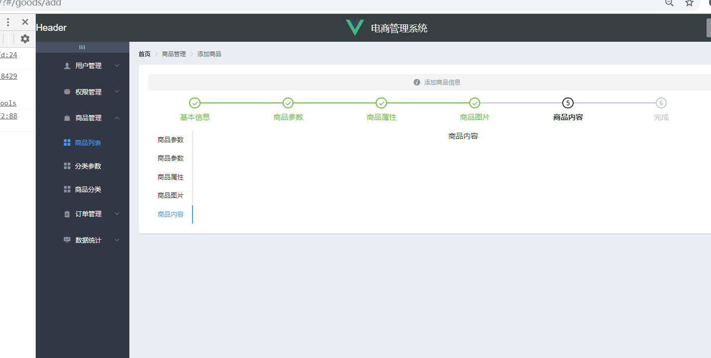 <div><!-- 面包屑导航区 --><el-breadcrumb separator-class="el-icon-arrow-right"><el-breadcrumb-item :to="{ path: '/home' }">首页</el-breadcrumb-item><el-breadcrumb-item>商品管理</el-breadcrumb-item><el-breadcrumb-item>添加商品</el-breadcrumb-item></el-breadcrumb><el-card><!-- 提示 --><el-alert title="添加商品信息" type="info" center show-icon :closable="false"></el-alert><!-- 步骤条 --><el-steps :space="200" :active="activeIndex-0" finish-status="success" align-center><el-step title="基本信息"></el-step><el-step title="商品参数"></el-step><el-step title="商品属性"></el-step><el-step title="商品图片"></el-step><el-step title="商品内容"></el-step><el-step title="完成"></el-step></el-steps><el-tabs v-model="activeIndex" :tab-position="'left'" style="height:200px;"><el-tab-pane label="商品参数" name="0">基本信息</el-tab-pane><el-tab-pane label="商品参数" name="1">商品参数</el-tab-pane><el-tab-pane label="商品属性" name="2">商品属性</el-tab-pane><el-tab-pane label="商品图片" name="3">商品图片</el-tab-pane><el-tab-pane label="商品内容" name="4">商品内容</el-tab-pane></el-tabs></el-card></div>