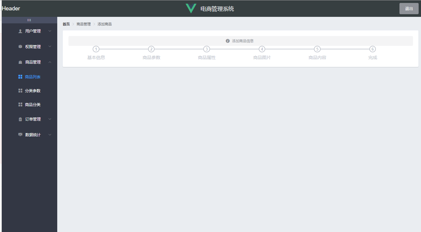 <div><!-- 面包屑导航区 --><el-breadcrumb separator-class="el-icon-arrow-right"><el-breadcrumb-item :to="{ path: '/home' }">首页</el-breadcrumb-item><el-breadcrumb-item>商品管理</el-breadcrumb-item><el-breadcrumb-item>添加商品</el-breadcrumb-item></el-breadcrumb><el-card><!-- 提示 --><el-alert title="添加商品信息" type="info" center show-icon :closable="false"></el-alert><!-- 步骤条 --><el-steps :space="200" :active="activeIndex - 0" finish-status="success" align-center><el-step title="基本信息"></el-step><el-step title="商品参数"></el-step><el-step title="商品属性"></el-step><el-step title="商品图片"></el-step><el-step title="商品内容"></el-step><el-step title="完成"></el-step></el-steps></el-card></div>