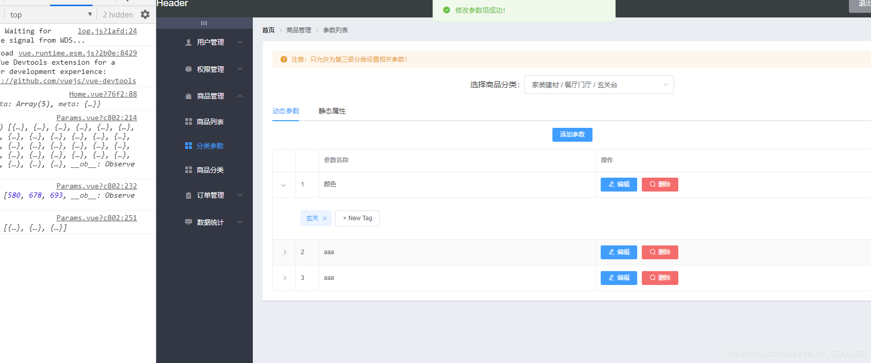 <template><div><!-- 面包屑导航区 --><el-breadcrumb separator-class="el-icon-arrow-right"><el-breadcrumb-item :to="{ path: '/home' }">首页</el-breadcrumb-item><el-breadcrumb-item>商品管理</el-breadcrumb-item><el-breadcrumb-item>参数列表</el-breadcrumb-item></el-breadcrumb><el-card><!-- 警告区域 --><el-alert title="注意:只允许为第三级分类设置相关参数!" type="warning" show-icon :closable="false"></el-alert><!-- 选择商品分类区域 --><el-row class="cat_opt"><el-col><span>选择商品分类:</span><!-- 商品分类的级联选择框 --><el-cascaderv-model="selectedCateKeys":options="cateList":props="cateProps"@change="handleChange"></el-cascader></el-col></el-row><el-tabs v-model="activeName" @tab-click="handleTabsClick"><el-tab-pane label="动态参数" name="many"><el-buttontype="primary"size="mini":disabled="isBtnDisabled "@click="addDialogVisible=true">添加参数</el-button><el-table :data="manyTableData" border stripe><el-table-column type="expand"><template slot-scope="scope"><el-tag v-for="(item, i) in scope.row.attr_vals" :key="i" closable@close="handleClose(i,scope.row)">{{item}}</el-tag><!-- 输入Tag文本框 --><el-inputclass="input-new-tag"v-if="scope.row.inputVisible"v-model="scope.row.inputValue"ref="saveTagInput"size="small"@keyup.enter.native="handleInputConfirm(scope.row)"@blur="handleInputConfirm(scope.row)"></el-input><el-button v-else class="button-new-tag" size="small" @click="showInput(scope.row)">+ New Tag</el-button></template></el-table-column><el-table-column type="index"></el-table-column><el-table-column label="参数名称" prop="attr_name"></el-table-column><el-table-column label="操作"><template slot-scope="scope"><el-buttontype="primary"icon="el-icon-edit"@click="showEditDialog(scope.row.attr_id)"size="mini">编辑</el-button><el-buttontype="danger"icon="el-icon-search"size="mini"@click="removeParams(scope.row.attr_id)">删除</el-button></template></el-table-column></el-table></el-tab-pane><el-tab-pane label="静态属性" name="only"><el-buttontype="primary"size="mini":disabled="isBtnDisabled"@click="addDialogVisible=true">添加属性</el-button><el-table :data="onlyTableData" border stripe><el-table-column type="expand"><template slot-scope="scope"><el-tag v-for="(item, i) in scope.row.attr_vals" :key="i">{{item}}</el-tag><!-- 输入Tag文本框 --></template></el-table-column><el-table-column type="index"></el-table-column><el-table-column label="属性名称" prop="attr_name"></el-table-column><el-table-column label="操作"><template slot-scope="scope"><el-buttontype="primary"icon="el-icon-edit"size="mini"@click="showEditDialog(scope.row.attr_id)">编辑</el-button><el-buttontype="danger"icon="el-icon-search"size="mini"@click="removeParams(scope.row.attr_id)">删除</el-button></template></el-table-column></el-table></el-tab-pane></el-tabs></el-card><el-dialog:title=" '添加' + getTitleText":visible.sync="addDialogVisible"width="50%"@close="addDialogClosed"><el-form :model="addFrom" :rules="addFromRules" ref="addFromRef" label-width="100px"><el-form-item :label="getTitleText" prop="attr_name"><el-input v-model="addFrom.attr_name"></el-input></el-form-item></el-form><span slot="footer" class="dialog-footer"><el-button @click="addDialogVisible = false">取 消</el-button><el-button type="primary" @click="addParams">确 定</el-button></span></el-dialog><el-dialog:title=" '修改' + getTitleText":visible.sync="editDialogVisible"width="50%"@close="editDialogClosed"><el-form :model="editFrom" :rules="editFromRules" ref="editFromRef" label-width="100px"><el-form-item :label="getTitleText" prop="attr_name"><el-input v-model="editFrom.attr_name"></el-input></el-form-item></el-form><span slot="footer" class="dialog-footer"><el-button @click="editDialogClosed = false">取 消</el-button><el-button type="primary" @click="editParams">确 定</el-button></span></el-dialog></div>