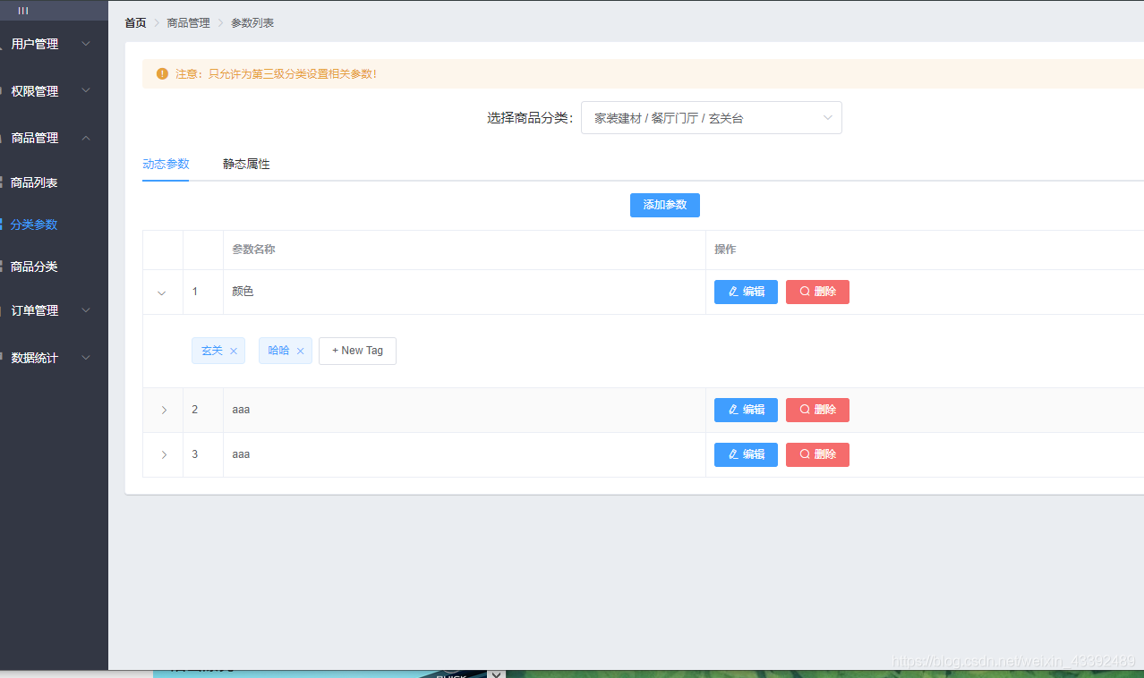 <template><div><!-- 面包屑导航区 --><el-breadcrumb separator-class="el-icon-arrow-right"><el-breadcrumb-item :to="{ path: '/home' }">首页</el-breadcrumb-item><el-breadcrumb-item>商品管理</el-breadcrumb-item><el-breadcrumb-item>参数列表</el-breadcrumb-item></el-breadcrumb><el-card><!-- 警告区域 --><el-alert title="注意:只允许为第三级分类设置相关参数!" type="warning" show-icon :closable="false"></el-alert><!-- 选择商品分类区域 --><el-row class="cat_opt"><el-col><span>选择商品分类:</span><!-- 商品分类的级联选择框 --><el-cascaderv-model="selectedCateKeys":options="cateList":props="cateProps"@change="handleChange"></el-cascader></el-col></el-row><el-tabs v-model="activeName" @tab-click="handleTabsClick"><el-tab-pane label="动态参数" name="many"><el-buttontype="primary"size="mini":disabled="isBtnDisabled "@click="addDialogVisible=true">添加参数</el-button><el-table :data="manyTableData" border stripe><el-table-column type="expand"><template slot-scope="scope"><el-tag v-for="(item, i) in scope.row.attr_vals" :key="i" closable>{{item}}</el-tag><!-- 输入Tag文本框 --><el-inputclass="input-new-tag"v-if="scope.row.inputVisible"v-model="scope.row.inputValue"ref="saveTagInput"size="small"@keyup.enter.native="handleInputConfirm(scope.row)"@blur="handleInputConfirm(scope.row)"></el-input><el-button v-else class="button-new-tag" size="small" @click="showInput(scope.row)">+ New Tag</el-button></template></el-table-column><el-table-column type="index"></el-table-column><el-table-column label="参数名称" prop="attr_name"></el-table-column><el-table-column label="操作"><template slot-scope="scope"><el-buttontype="primary"icon="el-icon-edit"@click="showEditDialog(scope.row.attr_id)"size="mini">编辑</el-button><el-buttontype="danger"icon="el-icon-search"size="mini"@click="removeParams(scope.row.attr_id)">删除</el-button></template></el-table-column></el-table></el-tab-pane><el-tab-pane label="静态属性" name="only"><el-buttontype="primary"size="mini":disabled="isBtnDisabled"@click="addDialogVisible=true">添加属性</el-button><el-table :data="onlyTableData" border stripe><el-table-column type="expand"><template slot-scope="scope"><el-tag v-for="(item, i) in scope.row.attr_vals" :key="i">{{item}}</el-tag><!-- 输入Tag文本框 --></template></el-table-column><el-table-column type="index"></el-table-column><el-table-column label="属性名称" prop="attr_name"></el-table-column><el-table-column label="操作"><template slot-scope="scope"><el-buttontype="primary"icon="el-icon-edit"size="mini"@click="showEditDialog(scope.row.attr_id)">编辑</el-button><el-buttontype="danger"icon="el-icon-search"size="mini"@click="removeParams(scope.row.attr_id)">删除</el-button></template></el-table-column></el-table></el-tab-pane></el-tabs></el-card><el-dialog:title=" '添加' + getTitleText":visible.sync="addDialogVisible"width="50%"@close="addDialogClosed"><el-form :model="addFrom" :rules="addFromRules" ref="addFromRef" label-width="100px"><el-form-item :label="getTitleText" prop="attr_name"><el-input v-model="addFrom.attr_name"></el-input></el-form-item></el-form><span slot="footer" class="dialog-footer"><el-button @click="addDialogVisible = false">取 消</el-button><el-button type="primary" @click="addParams">确 定</el-button></span></el-dialog><el-dialog:title=" '修改' + getTitleText":visible.sync="editDialogVisible"width="50%"@close="editDialogClosed"><el-form :model="editFrom" :rules="editFromRules" ref="editFromRef" label-width="100px"><el-form-item :label="getTitleText" prop="attr_name"><el-input v-model="editFrom.attr_name"></el-input></el-form-item></el-form><span slot="footer" class="dialog-footer"><el-button @click="editDialogClosed = false">取 消</el-button><el-button type="primary" @click="editParams">确 定</el-button></span></el-dialog></div>