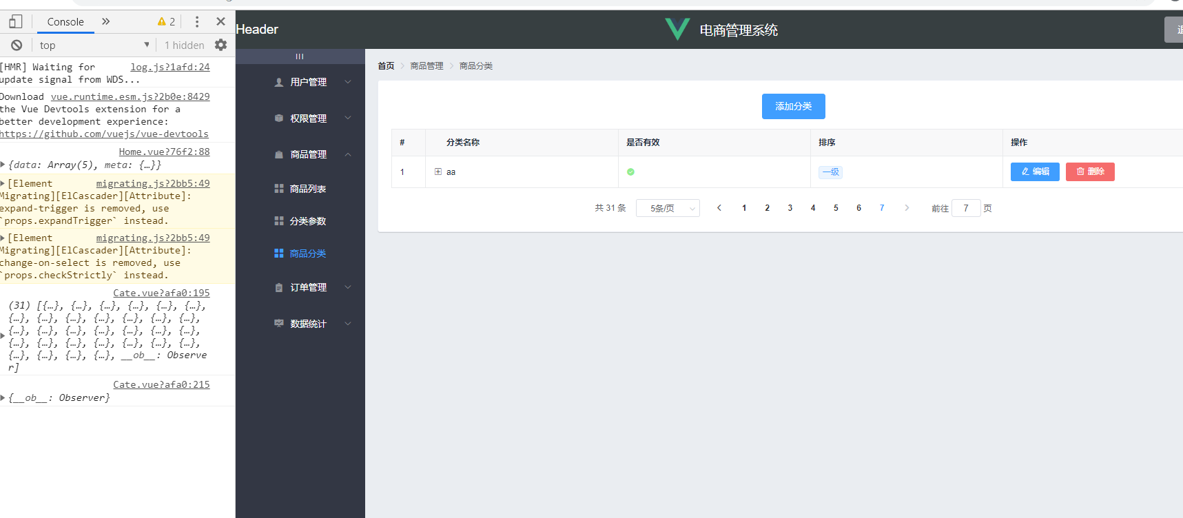 <template><div><!-- 面包屑导航区 --><el-breadcrumb separator-class="el-icon-arrow-right"><el-breadcrumb-item :to="{ path: '/home' }">首页</el-breadcrumb-item><el-breadcrumb-item>商品管理</el-breadcrumb-item><el-breadcrumb-item>商品分类</el-breadcrumb-item></el-breadcrumb><el-card><el-row><el-col><el-button type="primary" @click="showAddCateDialog">添加分类</el-button></el-col></el-row><tree-tableclass="treeTable":data="cateList":columns="columns":selection-type="false":expand-type="false"index-text="#":show-row-hover="false"show-indexborder><!-- 是否有效 --><template slot="isOk" slot-scope="scope"><iclass="el-icon-success"style="color: lightgreen"v-if="scope.row.cat_deleted === false"></i><iclass="el-icon-error"style="color:red" v-else></i></template><!-- 排序 --><template slot="order" slot-scope="scope"><el-tag size="mini" v-if="scope.row.cat_level === 0">一级</el-tag><el-tag size="mini" type="success" v-else-if="scope.row.cat_level === 1">二级</el-tag><el-tag size="mini" type="warning" v-else>三级</el-tag></template><!-- 操作 --><template slot="opt" slot-scope="scope"><el-button type="primary" icon="el-icon-edit" size="mini">编辑</el-button><el-button type="danger" icon="el-icon-delete" size="mini">删除</el-button></template></tree-table><!-- 分页 --><el-pagination@size-change="handleSizeChange"@current-change="handleCurrentChange":current-page="queryInfo.pagenum":page-sizes="[3, 5, 10, 15]":page-size="queryInfo.pagesize"layout="total, sizes, prev, pager, next, jumper":total="total"></el-pagination></el-card><!-- 添加分类的对话框 --><el-dialog title="添加分类" :visible.sync="addCateDialogVisible" width="50%" @close="addCatelogClosed"><el-form:model="addCateForm":rules="addCateFormRules"ref="addCateFormRef"label-width="100px"><el-form-item label="分类名称:" prop="cat_name"><el-input v-model="addCateForm.cat_name"></el-input></el-form-item><el-form-item label="父级分类:"><!-- options:数据源 --><!-- props:指定配置对象--><el-cascaderexpand-trigger="hover"v-model="selectedKeys":options="parentCateList":props="cascaderProps"@change="parentCateChanged"clearablechange-on-selectstyle="width: 100%"></el-cascader> <el-input v-model="addCateForm.cat_name"></el-input></el-form-item></el-form><span slot="footer" class="dialog-footer"><el-button @click="addCateDialogVisible = false">取 消</el-button><el-button type="primary" @click="addCate">确 定</el-button></span></el-dialog></div>