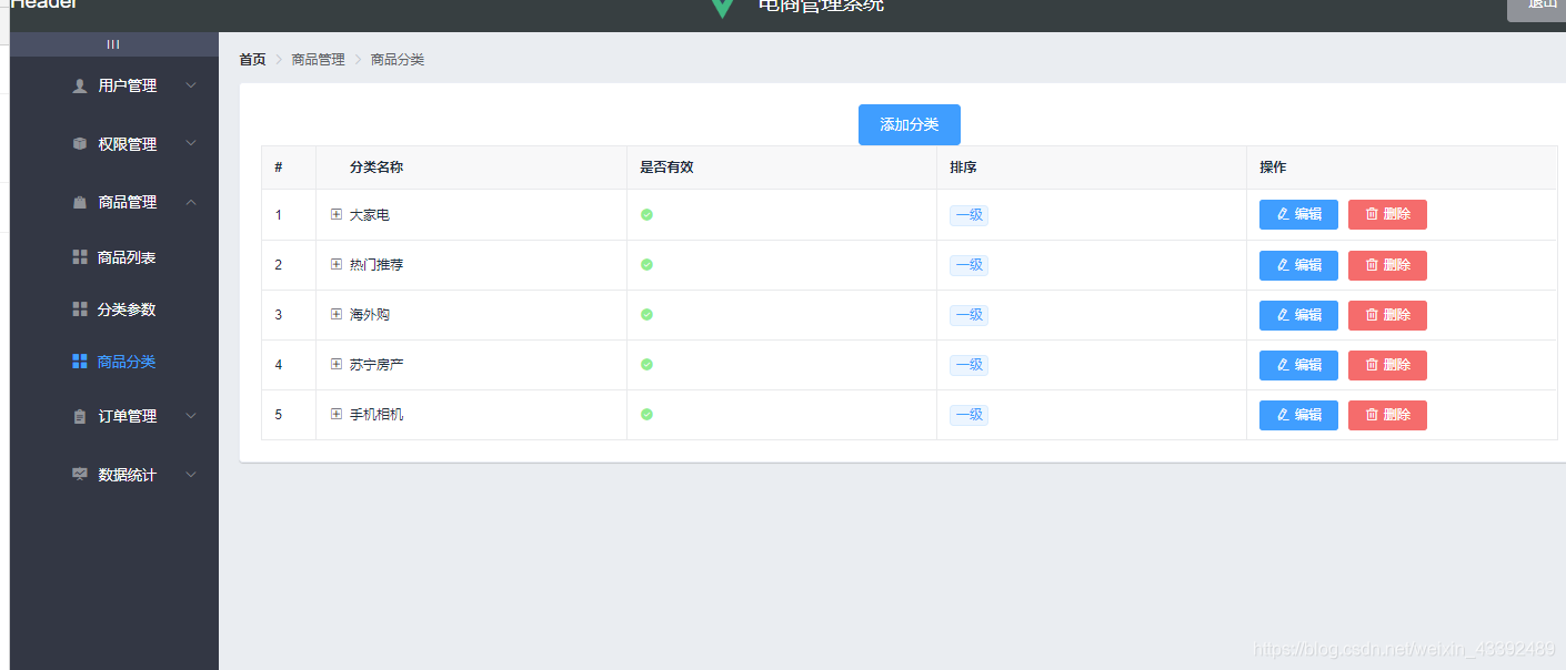 <template><div><!-- 面包屑导航区 --><el-breadcrumb separator-class="el-icon-arrow-right"><el-breadcrumb-item :to="{ path: '/home' }">首页</el-breadcrumb-item><el-breadcrumb-item>商品管理</el-breadcrumb-item><el-breadcrumb-item>商品分类</el-breadcrumb-item></el-breadcrumb><el-card><el-row><el-col><el-button type="primary">添加分类</el-button></el-col></el-row><tree-table:data="cateList":columns="columns":selection-type="false":expand-type="false"index-text="#":show-row-hover="false"show-indexborder><!-- 是否有效 --><template slot="isOk" slot-scope="scope"><iclass="el-icon-success"style="color: lightgreen"v-if="scope.row.cat_deleted === false"></i><iclass="el-icon-error"style="color:red" v-else></i></template><!-- 排序 --><template slot="order" slot-scope="scope"><el-tag size="mini" v-if="scope.row.cat_level === 0">一级</el-tag><el-tag size="mini" type="success" v-else-if="scope.row.cat_level === 1">二级</el-tag><el-tag size="mini" type="warning" v-else>三级</el-tag></template><!-- 操作 --><template slot="opt" slot-scope="scope"><el-button type="primary" icon="el-icon-edit" size="mini">编辑</el-button><el-button type="danger" icon="el-icon-delete" size="mini">删除</el-button></template></tree-table></el-card></div>