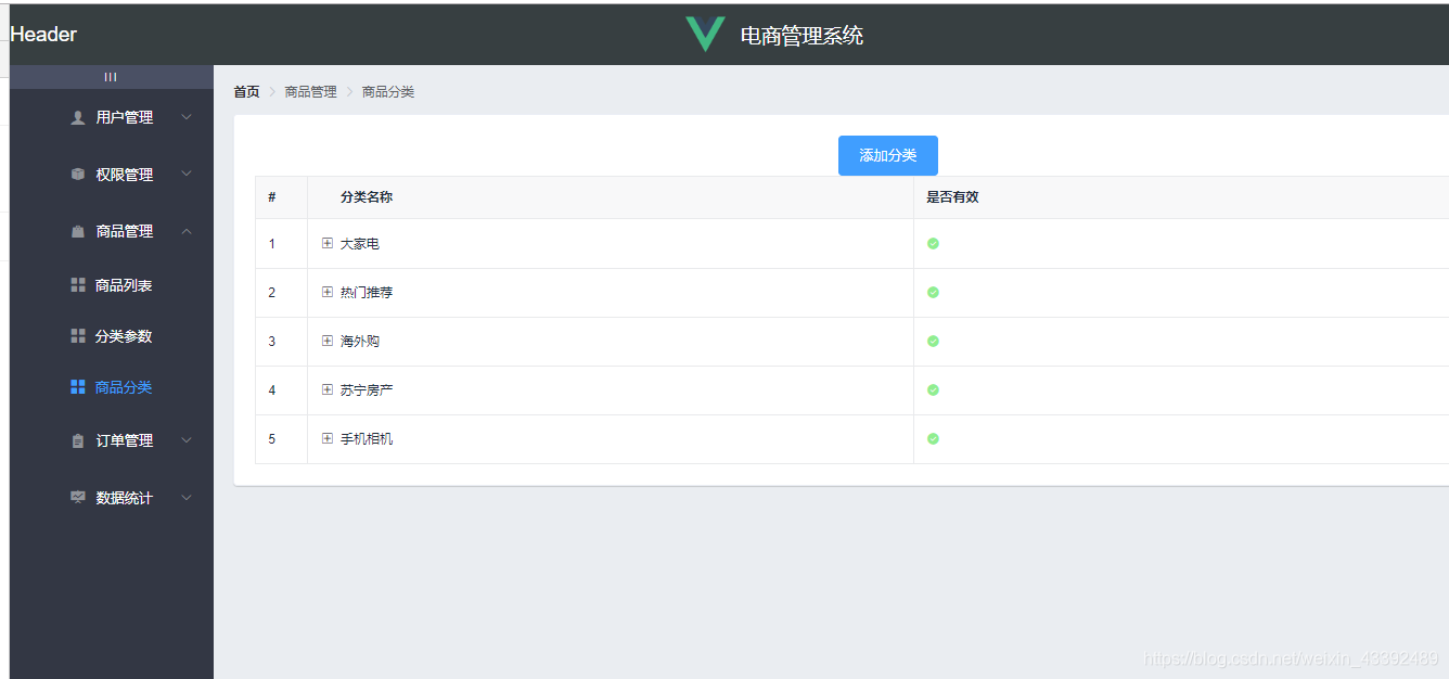 <template><div><!-- 面包屑导航区 --><el-breadcrumb separator-class="el-icon-arrow-right"><el-breadcrumb-item :to="{ path: '/home' }">首页</el-breadcrumb-item><el-breadcrumb-item>商品管理</el-breadcrumb-item><el-breadcrumb-item>商品分类</el-breadcrumb-item></el-breadcrumb><el-card><el-row><el-col><el-button type="primary">添加分类</el-button></el-col></el-row><tree-table:data="cateList":columns="columns":selection-type="false":expand-type="false"index-text="#":show-row-hover="false"show-indexborder><!-- 是否有效 --><template slot="isOk" slot-scope="scope"><iclass="el-icon-success"style="color: lightgreen"v-if="scope.row.cat_deleted === false"></i><iclass="el-icon-error"style="color:red"></i></template></tree-table></el-card></div>