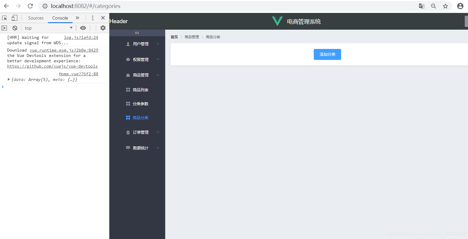 <template><div><!-- 面包屑导航区 --><el-breadcrumb separator-class="el-icon-arrow-right"><el-breadcrumb-item :to="{ path: '/home' }">首页</el-breadcrumb-item><el-breadcrumb-item>商品管理</el-breadcrumb-item><el-breadcrumb-item>商品分类</el-breadcrumb-item></el-breadcrumb><el-card><el-row><el-col><el-button type="primary">添加分类</el-button></el-col></el-row></el-card></div>