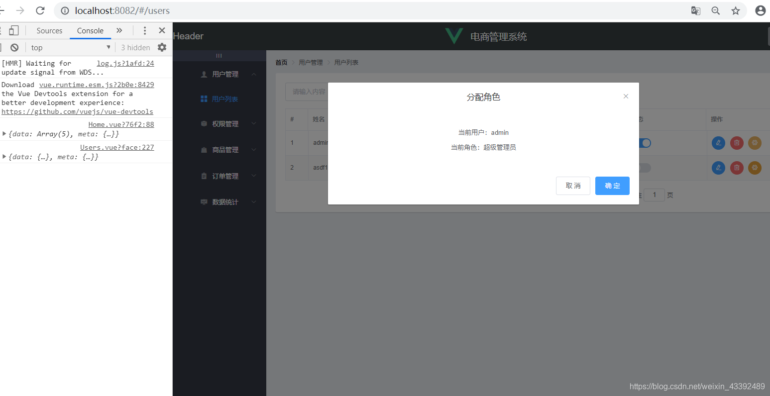 <template><div><!-- 面包屑导航区 --><el-breadcrumb separator-class="el-icon-arrow-right"><el-breadcrumb-item :to="{ path: '/home' }">首页</el-breadcrumb-item><el-breadcrumb-item>用户管理</el-breadcrumb-item><el-breadcrumb-item>用户列表</el-breadcrumb-item></el-breadcrumb><el-card><el-row :gutter="20"><el-col :span="7"><el-input placeholder="请输入内容" v-model="queryInfo.query" clearable @clear="getUserList"><el-button slot="append" icon="el-icon-search" @click="getUserList"></el-button></el-input></el-col><el-col :span="4"><el-button type="primary" @click="addDialogVisible=true">添加用户</el-button></el-col></el-row><el-table border stripe :data="userlist"><el-table-column type="index" label="#"></el-table-column><el-table-column prop="username" label="姓名"></el-table-column><el-table-column prop="email" label="邮箱"></el-table-column><el-table-column prop="mobile" label="电话"></el-table-column><el-table-column prop="role_name" label="角色"></el-table-column><el-table-column label="状态"><template slot-scope="scope"><el-switch v-model="scope.row.mg_state" @change="userStateChanged(scope.row)"></el-switch></template></el-table-column><el-table-column label="操作" width="180px"><template slot-scope="scope"><el-buttontype="primary"icon="el-icon-edit"size="mini"circle@click="showEditDialog(scope.row.id)"></el-button><el-button type="danger" icon="el-icon-delete" size="mini" circle@click="removeUserById(scope.row.id)"></el-button><el-tooltipclass="item"effect="dark"content="角色分配":enterable="false"placement="top"><el-button type="warning" icon="el-icon-setting" size="mini" circle@click="showSetRole(scope.row)"></el-button></el-tooltip></template></el-table-column></el-table><el-pagination@size-change="handleSizeChange"@current-change="handleCurrentChange":current-page="queryInfo.pagenum":page-sizes="[2, 5, 10, 15]":page-size="queryInfo.pagesize"layout="total, sizes, prev, pager, next, jumper":total="total"></el-pagination></el-card><!-- 添加用户的对话框 --><el-dialog title="添加用户" :visible.sync="addDialogVisible" width="50%" @close="addDialogClosed"><!-- 内容主体 --><el-form :model="addForm" ref="addFormRef" :rules="addFormRules" label-width="70px"><el-form-item label="用户名" prop="username"><el-input v-model="addForm.username"></el-input></el-form-item><el-form-item label="密码" prop="password"><el-input v-model="addForm.password"></el-input></el-form-item><el-form-item label="邮箱" prop="email"><el-input v-model="addForm.email"></el-input></el-form-item><el-form-item label="手机" prop="mobile"><el-input v-model="addForm.mobile"></el-input></el-form-item></el-form><span slot="footer" class="dialog-footer"><el-button @click="addDialogVisible = false">取 消</el-button><el-button type="primary" @click="addUser">确 定</el-button></span></el-dialog><!-- 修改用户的对话框 --><el-dialogtitle="修改用户信息":visible.sync="editDialogVisible"width="50%"@close="editDialogClosed"><el-form :model="editForm" ref="editUserFormRef" :rules="editFormRules" label-width="70px"><el-form-item label="用户名"><el-input v-model="editForm.username" disabled></el-input></el-form-item><el-form-item label="邮箱" prop="email"><el-input v-model="editForm.email"></el-input></el-form-item><el-form-item label="手机" prop="mobile"><el-input v-model="editForm.mobile"></el-input></el-form-item></el-form><span slot="footer" class="dialog-footer"><el-button @click="editDialogVisible = false">取 消</el-button><el-button type="primary" @click="editUserInfo">确 定</el-button></span></el-dialog><!-- 分配角色对话框 --><el-dialog title="分配角色" :visible.sync="setRoleDialogVisible" width="50%" ><div><p>当前用户:{{userInfo.username}}</p><p>当前角色:{{userInfo.role_name}}</p></div><span slot="footer" class="dialog-footer"><el-button @click="setRoleDialogVisible = false">取 消</el-button><el-button type="primary" @click="setRoleDialogVisible = false">确 定</el-button></span></el-dialog></div>