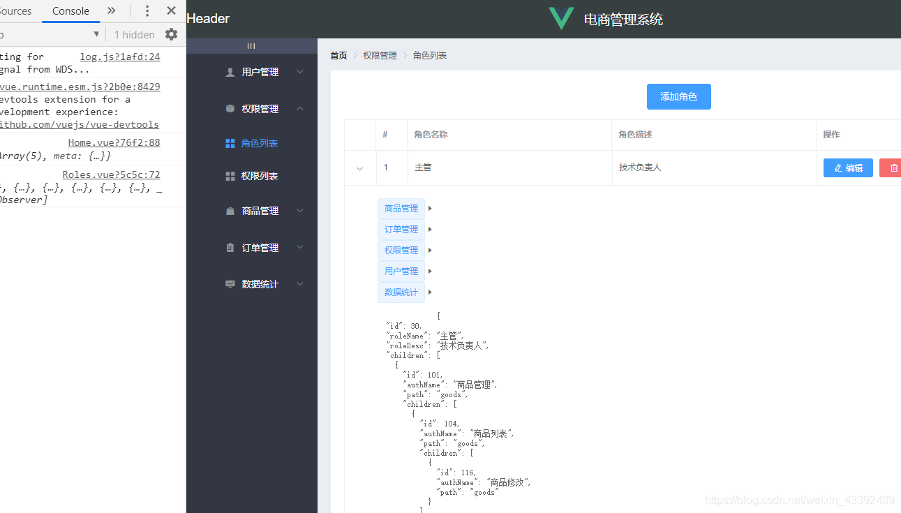 <template><div><!-- 面包屑导航区 --><el-breadcrumb separator-class="el-icon-arrow-right"><el-breadcrumb-item :to="{ path: '/home' }">首页</el-breadcrumb-item><el-breadcrumb-item>权限管理</el-breadcrumb-item><el-breadcrumb-item>角色列表</el-breadcrumb-item></el-breadcrumb><el-card><el-row><el-col><el-button type="primary">添加角色</el-button></el-col></el-row><el-table :data="roleslist" border stripe><el-table-column type="expand"><template slot-scope="scope"><el-row v-for="(item1, i1) in scope.row.children":key="item1.id"><!-- 一级权限 --><el-col :span="5"><el-tag > {{item1.authName}}</el-tag><i class="el-icon-caret-right"></i></el-col></el-row><pre>{{scope.row}}</pre></template></el-table-column><!-- 索引列 --><el-table-column type="index" label="#"></el-table-column><el-table-column label="角色名称" prop="roleName"></el-table-column><el-table-column label="角色描述" prop="roleDesc"></el-table-column><el-table-column label="操作" width="300px"><template slot-scope="scope"><el-button type="primary" icon="el-icon-edit" size="mini" >编辑</el-button><el-button type="danger" icon="el-icon-delete" size="mini" >删除</el-button><el-buttontype="warning"icon="el-icon-setting"size="mini">分配权限</el-button></template></el-table-column></el-table></el-card></div>