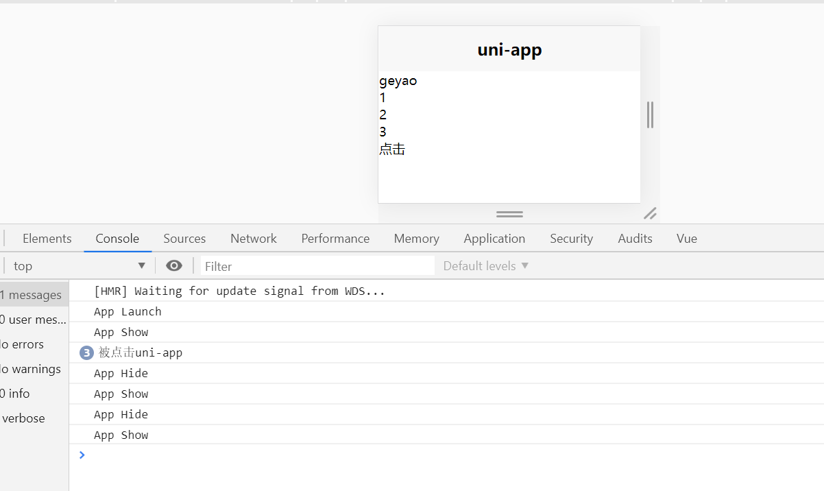 <template><view><view v-if="show">uniapp</view><view>geyao</view><view v-for="item in items">{{item}}</view><view v-on:click="onClick('uni-app')">点击</view></view>