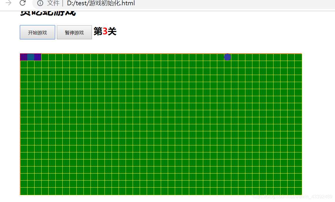 </head><body><div id="main"><!-- 按钮 --><h1>贪吃蛇游戏</h1><input class="btn" type="button" value="开始游戏" id="begin"><input class="btn" type="button" value="暂停游戏" id="pause"><span class="gtitle">第<span id="gnum">1</span>关</span></div><!-- 贪吃蛇游戏设计 --><script>var main = document.getElementById('main');/* 画布格子是否开启 */var showcanvas = true;/* atom 原子大小 xnum横向原子数量 ynum纵向原子数量 */function Map(atom, xnum, ynum) {this.atom = atom;this.xnum = xnum;this.ynum = ynum;//声明画布this.canvas = null;//第二部分 创建画布方法this.create = function() {this.canvas = document.createElement('div');this.canvas.style.cssText = 'position:relative;top:40px;border:1px solid red;background:#FAFAFA';this.canvas.style.width = this.atom * this.xnum + 'px'; //画布的宽this.canvas.style.height = this.atom * this.ynum + 'px'; //画布的宽main.appendChild(this.canvas);if (showcanvas) {for (var x = 0; x < xnum; x++) {for (var y = 0; y < ynum; y++) {var a = document.createElement('div');a.style.cssText = "border:1px solid yellow";a.style.width = this.atom + 'px';a.style.height = this.atom + 'px';a.style.backgroundColor = 'green';this.canvas.appendChild(a);a.style.position = 'absolute';a.style.left = x * this.atom + 'px';a.style.top = y * this.atom + 'px';}}}}}/*第四部分 创建蛇 */function Snake(map) {//设置宽度高度this.width = map.atom;this.height = map.atom;/* 蛇的方向 */this.direction = 'right';this.body = [{x: 2,y: 0}, //第一点{x: 1,y: 0}, //第二点{x: 0,y: 0} //第三点];//显示蛇this.display = function() {for (var i = 0; i < this.body.length; i++) {//当吃到食物时候 x==null 不能新建 不然会在00处新建一个if (this.body[i].x != null) {var s = document.createElement('div');//将蛇的节点保存到状态变量中 方便删除使用this.body[i].flag = s;/* console.log(1); *///设置蛇的样式s.style.width = this.width + 'px';s.style.height = this.height + 'px';s.style.backgroundColor = "rgb(" + Math.floor(Math.random() * 200) + "," +Math.floor(Math.random() * 200) + "," +Math.floor(Math.random() * 200) + ")"s.style.position = 'absolute';s.style.left = this.body[i].x * this.width + 'px';s.style.top = this.body[i].y * this.height + 'px';//添加到地图中map.canvas.appendChild(s);}}}/* 让蛇动起来 {x: 2,y: 0}, //第一点{x: 1,y: 0}, //第二点{x: 0,y: 0} //第四点 让蛇改变方向*/this.run = function() {for (var i = this.body.length - 1; i > 0; i--) {this.body[i].x = this.body[i - 1].x;this.body[i].y = this.body[i - 1].y;}//根据方向处理蛇头switch (this.direction) {case "left":this.body[0].x -= 1;break;case "right":this.body[0].x += 1;break;case "up":this.body[0].y -= 1;break;case "down":this.body[0].y += 1;break;}//判断蛇头吃到食物 蛇头坐标和食物坐标重合 第六部分if (this.body[0].x == food.x && this.body[0].y == food.y) {//蛇会加一个this.body.push({x: null,y: null,flag: null});//判断一下几倍if (this.body.length > l.slength) {l.set();}map.canvas.removeChild(food.flag);food = new Food(map);}//判断是否出界if (this.body[0].x < 0 || this.body[0].x > map.xnum - 1 || this.body[0].y < 0 || this.body[0].y > map.ynum - 1) {clearInterval(timer);alert("真笨啊,活活的撞墙了");restart(map, this);return false;}//判断是否和自己重合for (var i = 4; i < this.body.length; i++) {if (this.body[0].x == this.body[i].x && this.body[0].y == this.body[i].y) {clearInterval(timer);alert("真笨啊,活活的吃到自己了");restart(map, this);return false;}}/* console.log(111); *//* this.body[0].x += 1; */for (var i = 0; i < this.body.length; i++) {//不等于空 就删除 当吃到食物的时候 flag等于空if (this.body[i].flag != null) {map.canvas.removeChild(this.body[i].flag);}}this.display();//给body加键盘事件 第五步 给蛇改变方向window.onkeydown = function(e) {var event = e || window.event;switch (event.keyCode) {case 38:if (snake.direction != "down") {snake.direction = "up";}break;case 40:if (snake.direction != "up") {snake.direction = "down";}break;case 37:if (snake.direction != "right") {snake.direction = "left";}break;case 39:if (snake.direction != "left") {snake.direction = "right";}break;}}/* */}}//重新开始游戏 第六部分function restart(map, snake) {for (var i = 0; i < snake.body.length; i++) {map.canvas.removeChild(snake.body[i].flag);}snake.body = [{x: 2,y: 0}, //第一点{x: 1,y: 0}, //第二点{x: 0,y: 0} //第三点];snake.direction = 'right';snake.display();map.canvas.removeChild(food.flag);food = new Food(map);}//创建级别function Level() {this.num = 1; //第几级别this.speek = 300; //速度加快this.slength = 8; //每个关的长度判断this.set = function() {this.num++;if (this.speek <= 50) {this.speek = 50;} else {this.speek -= 50;}//可以自己定义this.slength += 3;this.display();start();}this.display = function() {document.getElementById('gnum').innerHTML = this.num;}}var l = new Level();l.display();var map = new Map(20, 40, 20);//创建画布map.create();//构造食物var food = new Food(map);//构建蛇var snake = new Snake(map);snake.display();/* 第三部分 创建食物 map地图对象 */function Food(map) {this.width = map.atom;this.height = map.atom;this.bgcolor = "rgb(" + Math.floor(Math.random() * 200) + "," + Math.floor(Math.random() * 200) + "," +Math.floor(Math.random() * 200) + ")"this.x = Math.floor(Math.random() * map.xnum);this.y = Math.floor(Math.random() * map.ynum);//画出食物this.flag = document.createElement('div');this.flag.style.width = this.width + 'px';this.flag.style.height = this.height + 'px';this.flag.style.backgroundColor = this.bgcolor;this.flag.style.borderRadius = '50%';this.flag.style.position = 'absolute';this.flag.style.left = this.x * this.width + 'px';this.flag.style.top = this.y * this.height + 'px';map.canvas.appendChild(this.flag);}var timer; //变量可以提升/* 第一部分 */function start() {clearInterval(timer);timer = setI