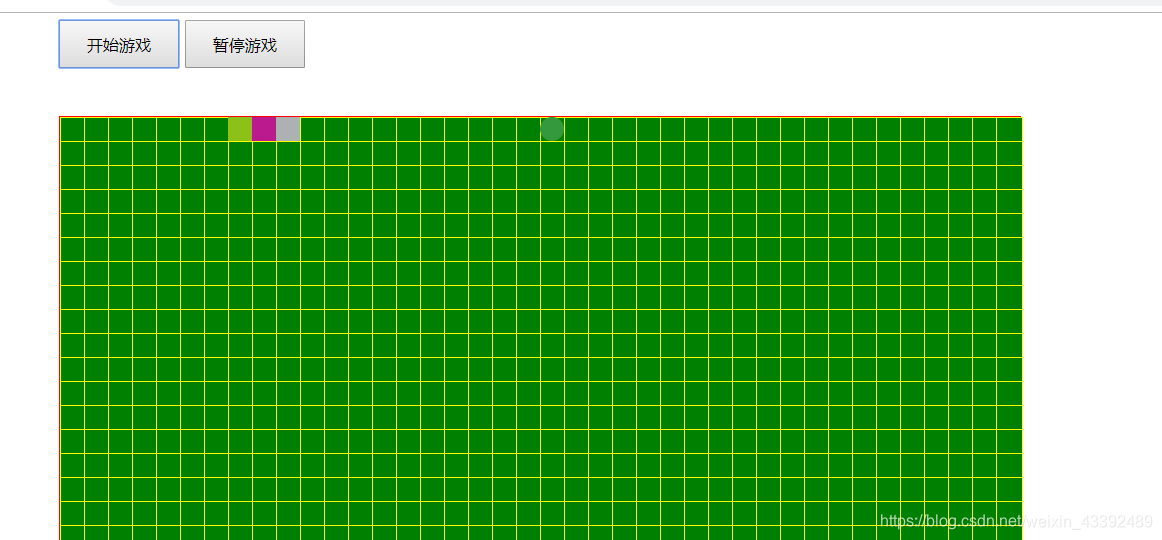 </head><body><div id="main"><!-- 按钮 --><input class="btn" type="button" value="开始游戏" id="begin"><input class="btn" type="button" value="暂停游戏" id="pause"></div><!-- 贪吃蛇游戏设计 --><script>var main = document.getElementById('main');/* 画布格子是否开启 */var showcanvas = true;/* atom 原子大小 xnum横向原子数量 ynum纵向原子数量 */function Map(atom, xnum, ynum) {this.atom = atom;this.xnum = xnum;this.ynum = ynum;//声明画布this.canvas = null;//第二部分 创建画布方法this.create = function() {this.canvas = document.createElement('div');this.canvas.style.cssText = 'position:relative;top:40px;border:1px solid red;background:#FAFAFA';this.canvas.style.width = this.atom * this.xnum + 'px'; //画布的宽this.canvas.style.height = this.atom * this.ynum + 'px'; //画布的宽main.appendChild(this.canvas);if (showcanvas) {for (var x = 0; x < xnum; x++) {for (var y = 0; y < ynum; y++) {var a = document.createElement('div');a.style.cssText = "border:1px solid yellow";a.style.width = this.atom + 'px';a.style.height = this.atom + 'px';a.style.backgroundColor = 'green';this.canvas.appendChild(a);a.style.position = 'absolute';a.style.left = x * this.atom + 'px';a.style.top = y * this.atom + 'px';}}}}}/*第四部分 创建蛇 */function Snake(map) {//设置宽度高度this.width = map.atom;this.height = map.atom;/* 蛇的方向 */this.direction = 'right';this.body = [{x: 2,y: 0}, //第一点{x: 1,y: 0}, //第二点{x: 0,y: 0} //第三点];//显示蛇this.display = function() {for (var i = 0; i < this.body.length; i++) {//当吃到食物时候 x==null 不能新建 不然会在00处新建一个if (this.body[i].x != null) {var s = document.createElement('div');//将蛇的节点保存到状态变量中 方便删除使用this.body[i].flag = s;/* console.log(1); *///设置蛇的样式s.style.width = this.width + 'px';s.style.height = this.height + 'px';s.style.backgroundColor = "rgb(" + Math.floor(Math.random() * 200) + "," +Math.floor(Math.random() * 200) + "," +Math.floor(Math.random() * 200) + ")"s.style.position = 'absolute';s.style.left = this.body[i].x * this.width + 'px';s.style.top = this.body[i].y * this.height + 'px';//添加到地图中map.canvas.appendChild(s);}}}/* 让蛇动起来 {x: 2,y: 0}, //第一点{x: 1,y: 0}, //第二点{x: 0,y: 0} //第四点 让蛇改变方向*/this.run = function() {for (var i = this.body.length - 1; i > 0; i--) {this.body[i].x = this.body[i - 1].x;this.body[i].y = this.body[i - 1].y;}//根据方向处理蛇头switch (this.direction) {case "left":this.body[0].x -= 1;break;case "right":this.body[0].x += 1;break;case "up":this.body[0].y -= 1;break;case "down":this.body[0].y += 1;break;}//判断蛇头吃到食物 蛇头坐标和食物坐标重合 第六部分if (this.body[0].x == food.x && this.body[0].y == food.y) {//蛇会加一个this.body.push({x: null,y: null,flag: null});map.canvas.removeChild(food.flag);food = new Food(map);}/* console.log(111); *//* this.body[0].x += 1; */for (var i = 0; i < this.body.length; i++) {//不等于空 就删除 当吃到食物的时候 flag等于空if (this.body[i].flag != null) {map.canvas.removeChild(this.body[i].flag);}}this.display();//给body加键盘事件 第五步 给蛇改变方向window.onkeydown = function(e) {var event = e || window.event;switch (event.keyCode) {case 38:if (snake.direction != "down") {snake.direction = "up";}break;case 40:if (snake.direction != "up") {snake.direction = "down";}break;case 37:if (snake.direction != "right") {snake.direction = "left";}break;case 39:if (snake.direction != "left") {snake.direction = "right";}break;}}/* */}}var map = new Map(20, 40, 20);//创建画布map.create();//构造食物var food = new Food(map);//构建蛇var snake = new Snake(map);snake.display();/* 第三部分 创建食物 map地图对象 */function Food(map) {this.width = map.atom;this.height = map.atom;this.bgcolor = "rgb(" + Math.floor(Math.random() * 200) + "," + Math.floor(Math.random() * 200) + "," +Math.floor(Math.random() * 200) + ")"this.x = Math.floor(Math.random() * map.xnum);this.y = Math.floor(Math.random() * map.ynum);//画出食物this.flag = document.createElement('div');this.flag.style.width = this.width + 'px';this.flag.style.height = this.height + 'px';this.flag.style.backgroundColor = this.bgcolor;this.flag.style.borderRadius = '50%';this.flag.style.position = 'absolute';this.flag.style.left = this.x * this.width + 'px';this.flag.style.top = this.y * this.height + 'px';map.canvas.appendChild(this.flag);}var timer; //变量可以提升/* 第一部分 *//* 第一部分开始 */document.getElementById('begin').onclick = function() {console.log(222);clearInterval(timer);timer = setInterval(function() {snake.run();}, 300)}/*第一部分 暂停 */document.getElementById('pause').onclick = function() {clearInterval(timer);timer = setInterval(function() {}, 300)}</script>