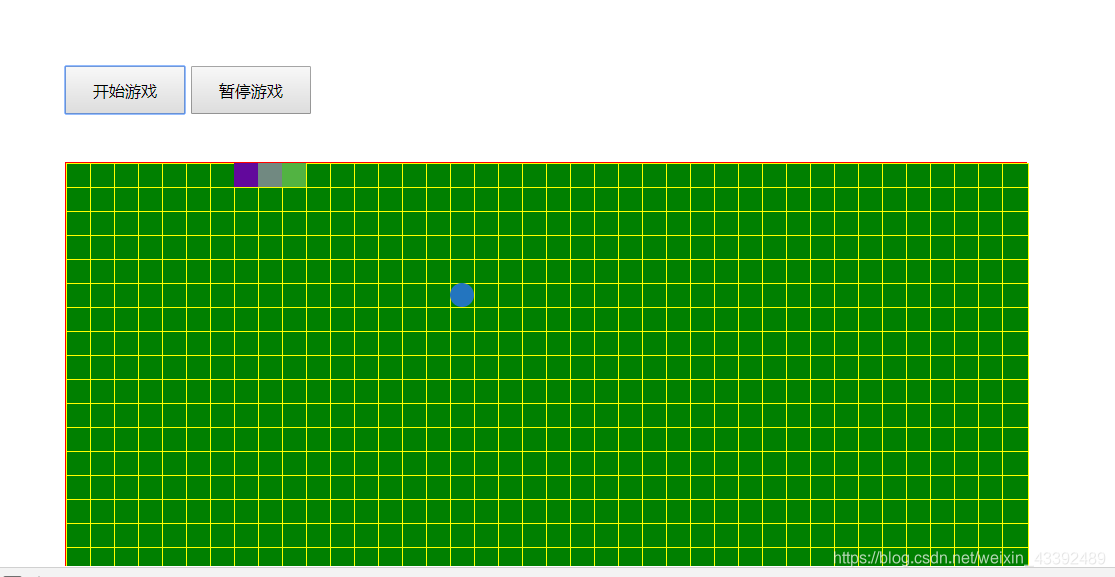 </head><body><div id="main"><!-- 按钮 --><input class="btn" type="button" value="开始游戏" id="begin"><input class="btn" type="button" value="暂停游戏" id="pause"></div><!-- 贪吃蛇游戏设计 --><script>var main = document.getElementById('main');/* 画布格子是否开启 */var showcanvas = true;/* atom 原子大小 xnum横向原子数量 ynum纵向原子数量 */function Map(atom, xnum, ynum) {this.atom = atom;this.xnum = xnum;this.ynum = ynum;//声明画布this.canvas = null;//第二部分 创建画布方法this.create = function() {this.canvas = document.createElement('div');this.canvas.style.cssText = 'position:relative;top:40px;border:1px solid red;background:#FAFAFA';this.canvas.style.width = this.atom * this.xnum + 'px'; //画布的宽this.canvas.style.height = this.atom * this.ynum + 'px'; //画布的宽main.appendChild(this.canvas);if (showcanvas) {for (var x = 0; x < xnum; x++) {for (var y = 0; y < ynum; y++) {var a = document.createElement('div');a.style.cssText = "border:1px solid yellow";a.style.width = this.atom + 'px';a.style.height = this.atom + 'px';a.style.backgroundColor = 'green';this.canvas.appendChild(a);a.style.position = 'absolute';a.style.left = x * this.atom + 'px';a.style.top = y * this.atom + 'px';}}}}}/*第四部分 创建蛇 */function Snake(map) {//设置宽度高度this.width = map.atom;this.height = map.atom;/* 蛇的方向 */this.direction = 'right';this.body = [{x: 2,y: 0}, //第一点{x: 1,y: 0}, //第二点{x: 0,y: 0} //第三点];//显示蛇this.display = function() {for (var i = 0; i < this.body.length; i++) {//当吃到食物时候 x==null 不能新建 不然会在00处新建一个if (this.body[i].x != null) {var s = document.createElement('div');//将蛇的节点保存到状态变量中 方便删除使用this.body[i].flag = s;/* console.log(1); *///设置蛇的样式s.style.width = this.width + 'px';s.style.height = this.height + 'px';s.style.backgroundColor = "rgb(" + Math.floor(Math.random() * 200) + "," +Math.floor(Math.random() * 200) + "," +Math.floor(Math.random() * 200) + ")"s.style.position = 'absolute';s.style.left = this.body[i].x * this.width + 'px';s.style.top = this.body[i].y * this.height + 'px';//添加到地图中map.canvas.appendChild(s);}}}/* 让蛇动起来 {x: 2,y: 0}, //第一点{x: 1,y: 0}, //第二点{x: 0,y: 0} //第三点*/this.run = function() {for (var i = this.body.length - 1; i > 0; i--) {this.body[i].x = this.body[i - 1].x;}console.log(111);this.body[0].x += 1;for (var i = 0; i < this.body.length; i++) {//不等于空 就删除 当吃到食物的时候 flag等于空if (this.body[i].flag != null) {map.canvas.removeChild(this.body[i].flag);}}this.display();/* */}}var map = new Map(20, 40, 20);//创建画布map.create();//构造食物var food = new Food(map);//构建蛇var snake = new Snake(map);snake.display();/* 第三部分 创建食物 map地图对象 */function Food(map) {this.width = map.atom;this.height = map.atom;this.bgcolor = "rgb(" + Math.floor(Math.random() * 200) + "," + Math.floor(Math.random() * 200) + "," +Math.floor(Math.random() * 200) + ")"this.x = Math.floor(Math.random() * map.xnum);this.y = Math.floor(Math.random() * map.ynum);//画出食物this.flag = document.createElement('div');this.flag.style.width = this.width + 'px';this.flag.style.height = this.height + 'px';this.flag.style.backgroundColor = this.bgcolor;this.flag.style.borderRadius = '50%';this.flag.style.position = 'absolute';this.flag.style.left = this.x * this.width + 'px';this.flag.style.top = this.y * this.height + 'px';map.canvas.appendChild(this.flag);}var timer; //变量可以提升/* 第一部分 *//* 第一部分开始 */document.getElementById('begin').onclick = function() {console.log(222);clearInterval(timer);timer = setInterval(function() {snake.run();}, 300)}/*第一部分 暂停 */document.getElementById('pause').onclick = function() {clearInterval(timer);timer = setInterval(function() {}, 300)}</script>