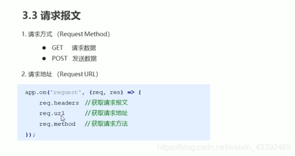 app.on('request', (req, res) => {//获取请求方式//console.log(req.method);//获取请求地址//console.log(req.url);if (req.url == '/index' || req.url == '/') {res.end('welcome to index')} else if (req.url == '/list') {res.end('welcome to list')} else {res.end('not found');}if (req.method == 'POST') {res.end('post')} else if (req.method == 'get') {res.end('get')}//res.end('<h2>hello user</h2>')