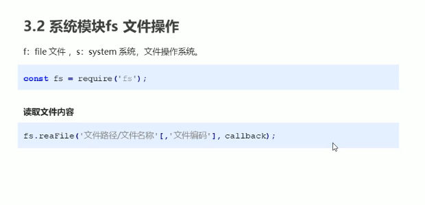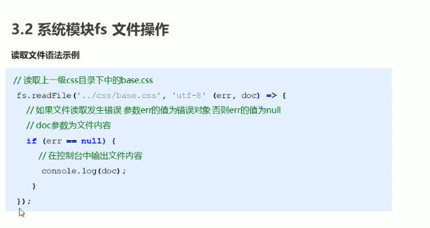 fs.readFile('./demo01.js', 'utf8', (err, doc) => {console.log(err);console.log(doc);