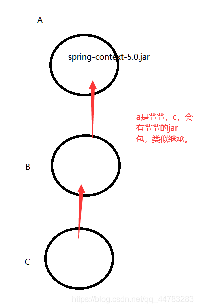 假设C依赖B,B依赖A,那么我们可以根据maven项目依赖的特征不难推出项目C也依赖A。