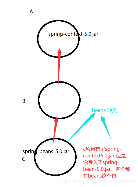 在maven中,依赖是可以传递的,假设存在三个项目,分别是项目A,项目B以及项目C。
