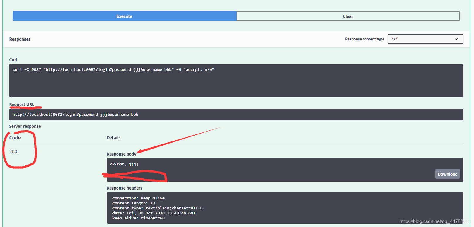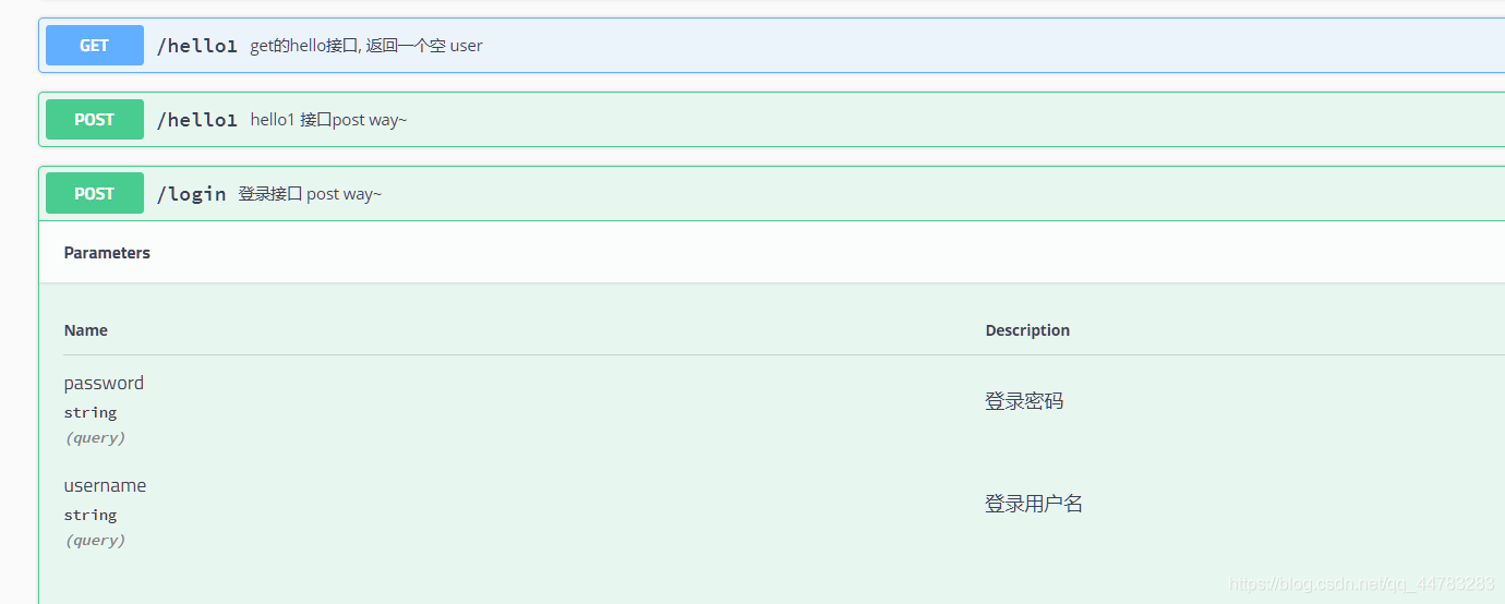 public class HelloController {@ApiOperation("get/post都可的hello接口")@RequestMapping(value = "/hello")public String hello() {return "hello";}@ApiOperation("get的hello接口, 返回一个空 user")@GetMapping(value = "/hello1")public User hello1() {return new User();}@ApiOperation("hello1 接口post way~")@PostMapping(value = "/hello1")public User hello1(@ApiParam("传递用户") User user) {return user;}@ApiOperation("登录接口 post way~")@PostMapping(value = "/login")public String login(@ApiParam("登录用户名") @RequestParam("username") String username,@ApiParam("登录密码") @RequestParam("password") String password) {return "ok" + "{" + username + ", " + password + "}";}}