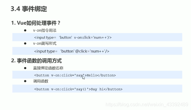 <!-- v-once显示的信息不需要后期修改 这样可以提高性能 --><body><div id="app"><div>{{num}}</div><div><button v-on:click='num++'>点击</button><button @click='num++'>点击1</button><button @click='handle'>点击2</button><button @click='handle()'>点击3</button></div></div><!-- 刷新的时候有闪动 --><script type="text/javascript" src="./js/vue.js"></script><script>/* VUE基本使用 *//* 填充数据 *//* 引入js *//* 语法功能 */var vm = new Vue({//绑定的标签el: '#app',//数据显示data: {//msg: 'Hello Vue',num: 0/* info: '你好' */},methods: {handle: function() {console.log(this === vm);this.num++;}}});</script>