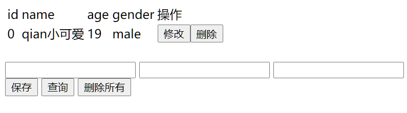 <html><head><meta charset="UTF-8"><title>学生利用localStorage curd</title><script type="text/javascript" src="../js/jquery-3.4.1.js" ></script><script>function save_stu() {if (window.Storage) {// 浏览器支持本地存储// 学生集合字符串var stuListStr = localStorage.getItem("stuList");// 学生json集合对象var stuList;// 学生为空if (!stuListStr) {stuListStr = "[]";} // 转换json对象stuList = JSON.parse(stuListStr);// 取到学生var name = $("#name").val();var age = $("#age").val();var gender = $("#gender").val();var stu = {"name":name, "age":age, "gender":gender};// 修改并 保存学生!!!var index = $("#stuId").val();if (index) {// 修改stuList[index] = stu;$("#stuId").val("");} else {// 新增到集合stuList.push(stu); }// 转换为字符串stuList = JSON.stringify(stuList);// 保存到storagelocalStorage.setItem("stuList", stuList);// 清空文本框$("#name").val("");$("#age").val("");$("#gender").val("");// 查询query_stu();}}function query_stu() {// 清空表格$("table tr:gt(0)").remove();// console.log(!localStorage.hasOwnProperty("stuList"));if (!localStorage.hasOwnProperty("stuList"))return;// 把Storage中的数据绑定到 表格if (window.Storage) {var stuListStr = localStorage.getItem("stuList");var stuList = JSON.parse(stuListStr);for (var i = 0; i < stuList.length; i++) {var stu = stuList[i];var tr = "<tr> <td>" + i + "</td> "+ "<td>" + stu.name + "</td> " + "<td>" + stu.age + "</td>" + "<td>" + stu.gender + "</td> "+ "<td>" + "<button οnclick='edit_stu(" + i + ")'>修改</button>" + "<button οnclick='del_stu(" + i + ")'>删除</button>"+ "</td>"+ " </tr>";$("table:eq(0)").append(tr);}}}function edit_stu(index) {// stu json objectvar stu = JSON.parse(localStorage.getItem("stuList"))[index];console.log(stu);// 赋值$("#name").val(stu.name);$("#age").val(stu.age);$("#gender").val(stu.gender); // 赋值id 隐藏$("#stuId").val(index);}function del_stu(index) {var stuListStr = localStorage.getItem("stuList");// console.log(stuListStr);var stuList = JSON.parse(stuListStr);// 从index开始删除一位stuList.splice(index, 1);// 删除本地储存..localStorage.removeItem("stuList");// 再保存..localStorage.setItem("stuList", JSON.stringify(stuList));query_stu();}</script></head><body><table><tr><td>id</td><td>name</td><td>age</td><td>gender</td><td>操作</td></tr></table><br /><input type="hidden" id="stuId" /><input type="text" id="name" /><input type="text" id="age" /><input type="text" id="gender" /><br /><input type="button" value="保存" onclick="save_stu()" /><!--<input type="button" onclick="edit_stu()" />--><input type="button" value="查询" onclick="query_stu()" /><input type="button" value="删除所有" onclick="localStorage.removeItem('stuList');" /></body>