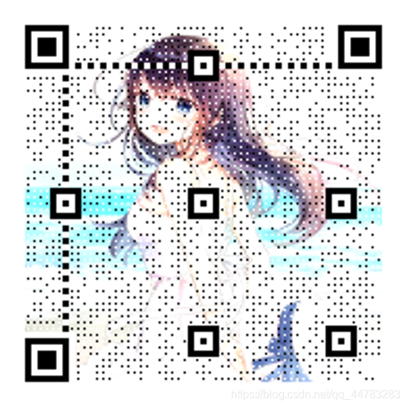print(os.getcwd())version, level, qr_name = myqr.run('https://blog.csdn.net/qq_44783283', # 二维码里面的信息(你要跳转的网站或者文字信息)version=10, # 大小为 1-40 pxlevel='H', # L, M, Q, Hpicture='funny.gif', # None 或者 二维码的背景图片colorized=True, # 使图像着色contrast=1.1, # 默认1.0 值越高 色彩对比越高,没有上限brightness=1.3, # 控制亮度 同上save_name='gif_result.gif', # 二维码输出名称save_dir=os.getcwd() # 输出到当前目录