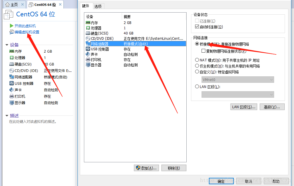 在桥接模式下,VMWare虚拟出来的操作系统就像是局域网中的一台独立的主机(主机和虚拟机处于对等地位),它可以访问网内任何一台机器。在桥接模式下,我们往往需要为虚拟主机配置IP地址、子网掩码等(注意虚拟主机的ip地址要和主机ip地址在同一网段)。
