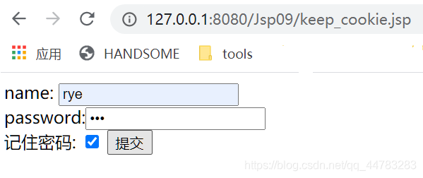 <form action="testCookie" method="post">name: <input type="text" name="name" value="${ cookie.name.value }"/> <br/>password:<input type="password" name="pwd" value="${ cookie.pwd.value }"/> <br/>记住密码: <input type="checkbox" name="remPwd" value="1"/><input type="submit" value="提交"/></form>
