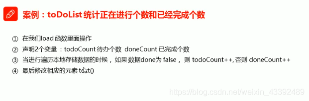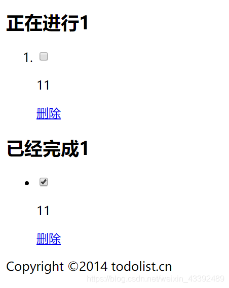 </head><body><header><section><label for="title">ToDoList</label><input type="text" id="title" placeholder="添加ToDo"></section></header><section><h2>正在进行<span id="todocount"></span></h2><ol id="todolist" class="demo-box"></ol><h2>已经完成<span id="donecount"></span></h2><ul id="donelist"></ul></section><footer>Copyright ©2014 todolist.cn</footer><script>var todolist = [{title: '我今天吃了八个馒头',done: false}, {title: '我今天学习jq',done: false}, ];localStorage.setItem("todo", JSON.stringify(todolist));//本地的数组转换为json.stringfy();var data = localStorage.getItem("todo");console.log(typeof data);//获取本地存储数据需要把字符串数据转换为对象形式json.parsedata = JSON.parse(data);console.log(data);$(function() {//todolist渲染到界面load();//按下回车 把完整数据存储到本地存储里面$("#title").on("keydown", function(event) {if (event.keyCode === 13) {if ($(this).val() === "") {alert("请输入数值");} else {//先读取本地存储原来的数据var local = getDate();console.log(local);//把local数组更新元素local.push({title: $(this).val(),done: false});//把这个数组给本地存储saveDate(local);//todolist渲染到界面load();$(this).val("");}}});//todolist删除事件$("ol,ul").on("click", "a", function() {//获取本地存储var data = getDate();console.log(data);//修改数据var index = $(this).attr("id");console.log(index);//保存到本地存储data.splice(index, 1);//渲染saveDate(data);load();});//正在进行和已完成$("ol,ul").on("click", "input", function() {//获取本地存储的数据var data = getDate();//修改数据var index = $(this).siblings("a").attr("id");//data[index].done = $(this).prop("checked");// console.log(data);//保存到本地存储saveDate(data);//渲染load();})//读取本地存储的数据function getDate() {var data = localStorage.getItem("todolist");if (data !== null) {//本地存储里面的数据是字符串格式的return JSON.parse(data);} else {//返回一个数组return [];}}//保存数据function saveDate(data) {localStorage.setItem("todolist", JSON.stringify(data));}//渲染数据function load() {//读取本地的数据var data = getDate(data);console.log(data);//遍历之前清空$("ol,ul").empty();var todoCount = 0; //正在进行的个数var doneCount = 0; //已经完成的个数//遍历整个数据$.each(data, function(i, n) {//console.log(n);if (n.done) {$("ul").prepend("<li><input type='checkbox' checked='checked'><p>" + n.title +"</p><a href='javascript:;' id=" + i + ">删除</a></li>");doneCount++;} else {$("ol").prepend("<li><input type='checkbox'><p>" + n.title +"</p><a href='javascript:;' id=" + i + ">删除</a></li>");todoCount++;}$("#todocount").text(todoCount);$("#donecount").text(doneCount);})}});</script>