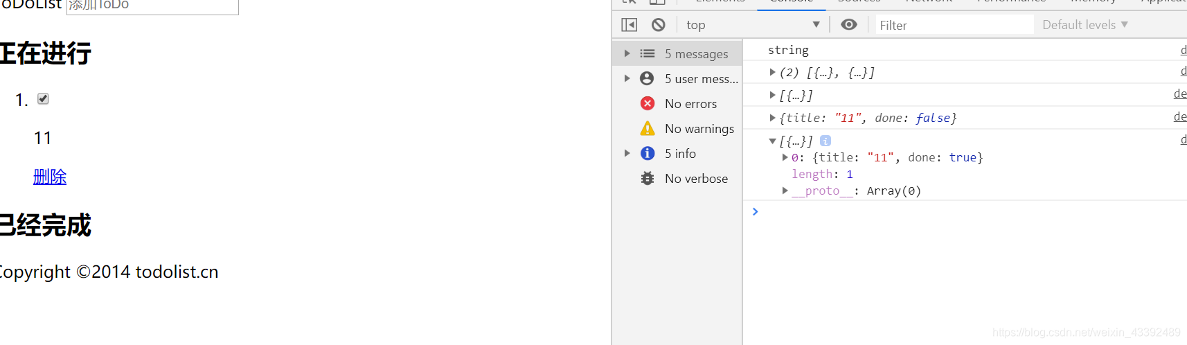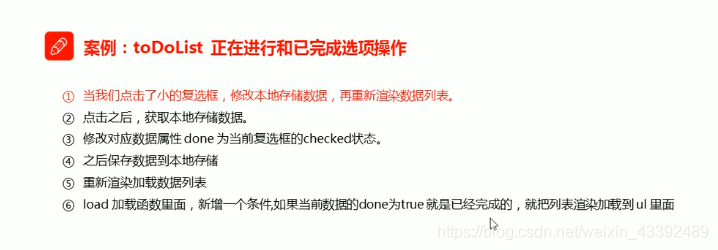 </head><body><header><section><label for="title">ToDoList</label><input type="text" id="title" placeholder="添加ToDo"></section></header><section><h2>正在进行<span id="rodocount"></span></h2><ol id="todolist" class="demo-box"></ol><h2>已经完成<span id="rodocount"></span></h2><ul id="donelist"></ul></section><footer>Copyright ©2014 todolist.cn</footer><script>var todolist = [{title: '我今天吃了八个馒头',done: false}, {title: '我今天学习jq',done: false}, ];localStorage.setItem("todo", JSON.stringify(todolist));//本地的数组转换为json.stringfy();var data = localStorage.getItem("todo");console.log(typeof data);//获取本地存储数据需要把字符串数据转换为对象形式json.parsedata = JSON.parse(data);console.log(data);$(function() {//todolist渲染到界面load();//按下回车 把完整数据存储到本地存储里面$("#title").on("keydown", function(event) {if (event.keyCode === 13) {//先读取本地存储原来的数据var local = getDate();console.log(local);//把local数组更新元素local.push({title: $(this).val(),done: false});//把这个数组给本地存储saveDate(local);//todolist渲染到界面load();}});//todolist删除事件$("ol").on("click", "a", function() {//获取本地存储var data = getDate();console.log(data);//修改数据var index = $(this).attr("id");console.log(index);//保存到本地存储data.splice(index, 1);//渲染saveDate(data);load();});//正在进行和已完成$("ol,ul").on("click", "input", function() {//获取本地存储的数据var data = getDate();//修改数据var index = $(this).siblings("a").attr("id");//data[index].done = $(this).prop("checked");console.log(data);})//读取本地存储的数据function getDate() {var data = localStorage.getItem("todolist");if (data !== null) {//本地存储里面的数据是字符串格式的return JSON.parse(data);} else {//返回一个数组return [];}}//保存数据function saveDate(data) {localStorage.setItem("todolist", JSON.stringify(data));}//渲染数据function load() {//读取本地的数据var data = getDate(data);console.log(data);//遍历之前清空$("ol").empty();//遍历整个数据$.each(data, function(i, n) {console.log(n);$("ol").prepend("<li><input type='checkbox'><p>" + n.title +"</p><a href='javascript:;' id=" + i + ">删除</a></li>");})}});</script>