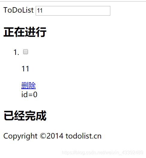 </head><body><header><section><label for="title">ToDoList</label><input type="text" id="title" placeholder="添加ToDo"></section></header><section><h2>正在进行<span id="rodocount"></span></h2><ol id="todolist" class="demo-box"></ol><h2>已经完成<span id="rodocount"></span></h2><ul id="donelist"></ul></section><footer>Copyright ©2014 todolist.cn</footer><script>var todolist = [{title: '我今天吃了八个馒头',done: false}, {title: '我今天学习jq',done: false}, ];localStorage.setItem("todo", JSON.stringify(todolist));//本地的数组转换为json.stringfy();var data = localStorage.getItem("todo");console.log(typeof data);//获取本地存储数据需要把字符串数据转换为对象形式json.parsedata = JSON.parse(data);console.log(data);$(function() {//todolist渲染到界面load();//按下回车 把完整数据存储到本地存储里面$("#title").on("keydown", function(event) {if (event.keyCode === 13) {//先读取本地存储原来的数据var local = getDate();console.log(local);//把local数组更新元素local.push({title: $(this).val(),done: false});//把这个数组给本地存储saveDate(local);//todolist渲染到界面load();}});//todolist删除事件$("ol").on("click", "a", function() {//获取本地存储var data = getDate();console.log(data);//修改数据var index = $(this).attr("id");console.log(index);//保存到本地存储data.splice(index, 1);//渲染saveDate(data);load();});//读取本地存储的数据function getDate() {var data = localStorage.getItem("todolist");if (data !== null) {//本地存储里面的数据是字符串格式的return JSON.parse(data);} else {//返回一个数组return [];}}//保存数据function saveDate(data) {localStorage.setItem("todolist", JSON.stringify(data));}//渲染数据function load() {//读取本地的数据var data = getDate(data);console.log(data);//遍历之前清空$("ol").empty();//遍历整个数据$.each(data, function(i, n) {console.log(n);$("ol").prepend("<li><input type='checkbox'><p>" + n.title +"</p><a href='javascript:;'>删除</a></li> id=" + i + "");})}});</script>