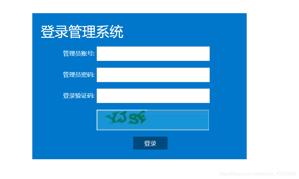 </head><body><!-- 登录框 --><div class="login"><!-- 登录框具体部分 --><div class="loginmain"><h4>登录管理系统</h4><form action="/" method="get"><ul><li><span>管理员账号:</span><input type="text" name="username" value=""></li><li><span>管理员密码:</span><input type="password" name="password" value=""></li><li><span>登录验证码:</span><input type="text" name="verifyimg" value=""></li><li><div class="verifyimg"><img src="./image/verifyimg.jpg" width="100%" height="100%" alt=""></div></li><li><input type="button" value="登录"></li></ul></form></div></div>