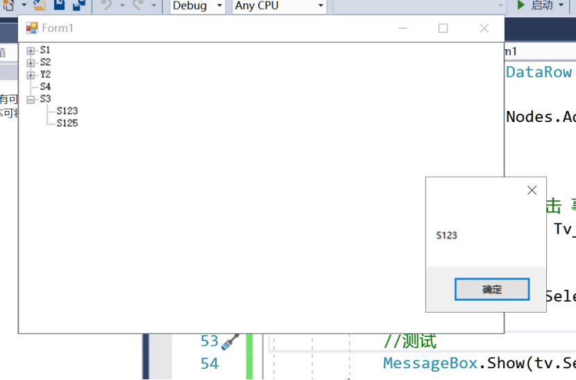 //把 tv 作为全局变量 , 这是对动态控件取值的一种方式TreeView tv = new TreeView();private void Form1_Load(object sender, EventArgs e){//把tv加入窗体Controls.Add(tv);//填满tv.Dock = DockStyle.Fill;DataTable dt = DBHelper.ExecuteTable("select * from grade");//遍历年级foreach (DataRow row in dt.Rows){//一行 一个节点TreeNode node = new TreeNode();//树节点 是 年级名node.Text = row["GradeName"].ToString();tv.Nodes.Add(node);//得到年级对应的这个班级DataTable classs = DBHelper.ExecuteTable(string.Format("select * from class where gradeid = '{0}'",row["gradeid"]));//把班级名 加到这个年级下foreach (DataRow item in classs.Rows){node.Nodes.Add(item["ClassName"].ToString());}}//双击table 生成点击 事件tv.AfterSelect += Tv_AfterSelect;}private void Tv_AfterSelect(object sender, TreeViewEventArgs e){//测试 MessageBox.Show(tv.SelectedNode.Text);//动态控件好处之一 值随数据库的改变 自身 样式 也随之改变}
