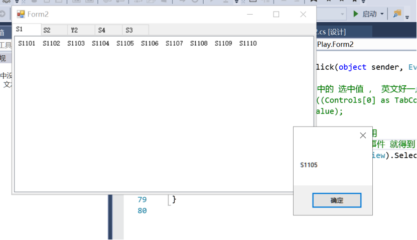 private void Form2_Load(object sender, EventArgs e){ArrayList arr = new ArrayList();//tabcontrol + listview 动态控件TabControl tc = new TabControl();tc.Dock = DockStyle.Fill;this.Controls.Add(tc);DataTable grade = DBHelper.ExecuteTable("select * from Grade");foreach (DataRow row in grade.Rows){//一个选项卡页 对应 一个 年级名TabPage tp = new TabPage(row["gradeName"].ToString());//把年级 添加到 选项卡 中的 选项页tc.TabPages.Add(tp);// 实例化一个 listview ListView lv = new ListView();//并 加入到 每个 选项卡页tp.Controls.Add(lv);//双击事件 lv.DoubleClick += Lv_DoubleClick;lv.Dock = DockStyle.Fill;//得到班级信息DataTable classs = DBHelper.ExecuteTable(string.Format("select * from class where gradeid = '{0}'", row["gradeid"]));foreach (DataRow item in classs.Rows){//遍历 班级表 并把班级 加入到 每个listview 中ListViewItem lvi = new ListViewItem(item["ClassName"].ToString());lv.Items.Add(lvi);}}}private void Lv_DoubleClick(object sender, EventArgs e){//这是得到 listview 中的 选中值 , 英文好一点 就 看懂了 但这种方式最死,而且 蠢 易出错//string value = ( ((Controls[0] as TabControl).SelectedTab as TabPage).Controls[0] as ListView ).SelectedItems[0].Text;//MessageBox.Show(value);//第三种方式 , 面向对象思想的 运用 //如果 list view 触发了 这个双击事件 就得到 选中的值string value = (sender as ListView).SelectedItems[0].Text;MessageBox.Show(value);}