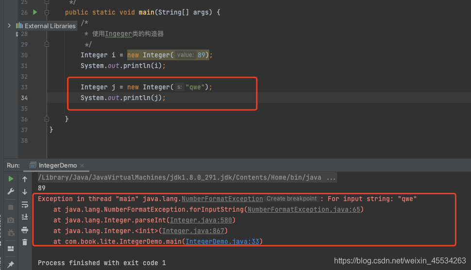public class IntegerDemo {/*** @author zhangyu* @date 2021/8/15 4:57 下午* @param args* Integer类的构造方法* 参数是int类型,或String类型*/public static void main(String[] args) {/** 使用Ingeger类的构造器*/Integer i = new Integer(89);System.out.println(i);// Integer j = new Integer("qwe");
