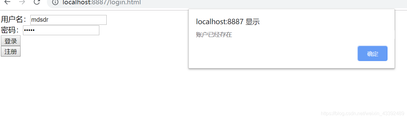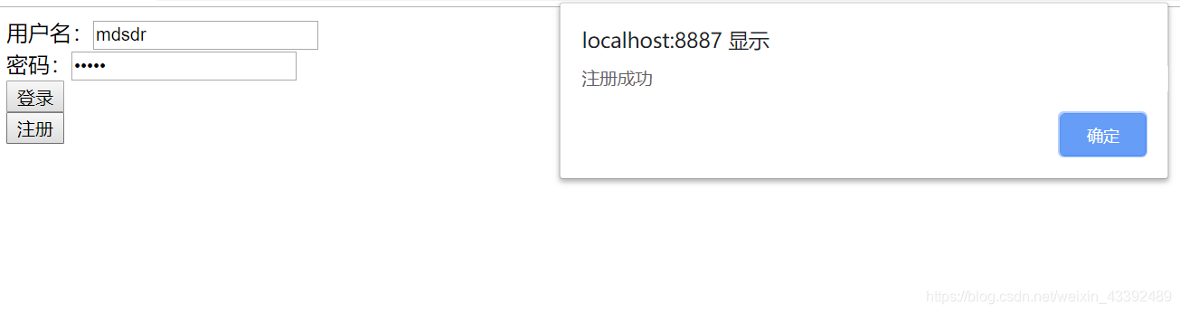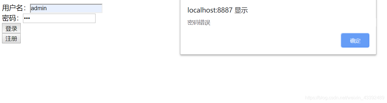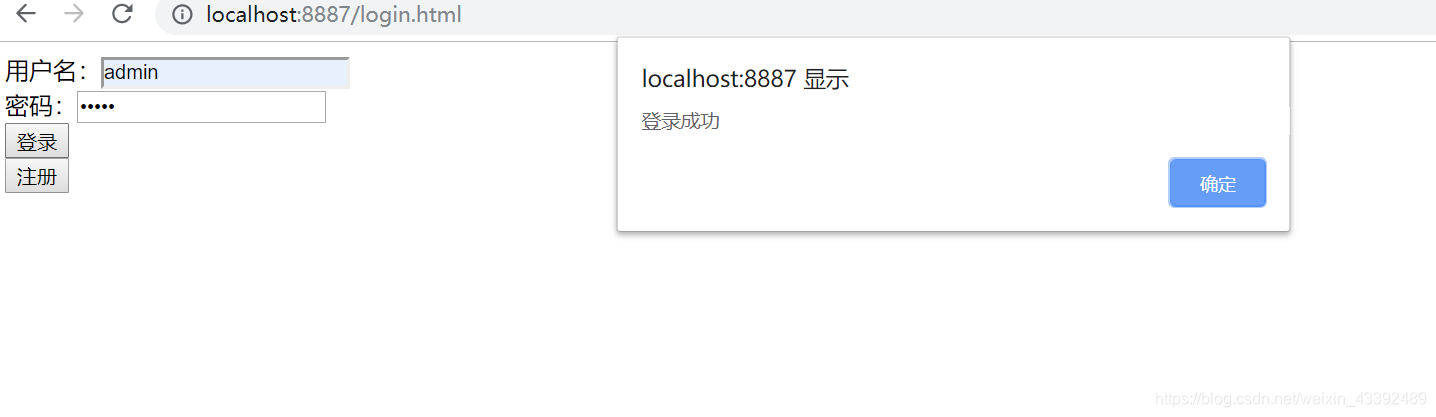 <body>用户名:<input type="text" id="username"><br/> 密码:<input type="password" id='password'><br/><button id="login">登录</button><br/><button id="reg">注册</button><br/><script>$('#login').click(function() {$.ajax({url: "/login",data: {username: $('#username').val(),password: $('#password').val()},dataType: "json",success(res) {//执行成功返回的是json值if (res.err) {alert(res.msg)} else {alert("登录成功")location.href="admin.html"}}})})$('#reg').click(function() {$.ajax({url: "/reg",method:"post",data: {username: $('#username').val(),password: $('#password').val()},dataType: "json",success(res) {//执行成功返回的是json值if (res.err) {alert(res.msg)} else {alert("注册成功")}}})})</script>