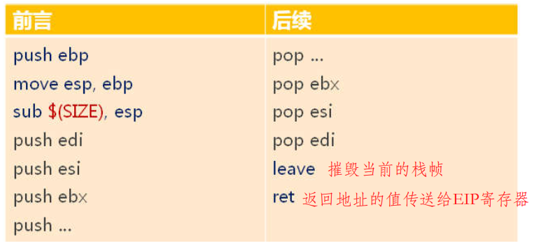 前言和后序的具体汇编上的行为大概就是下面表格中所列的一些行为: