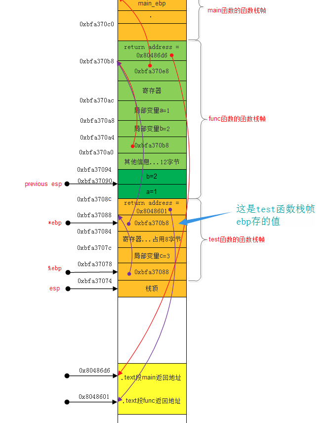 - 然后将func函数的ebp值的地址也就是0xbfa370b8,压入栈中,此时test函数栈帧中的ebp就指向这个值。