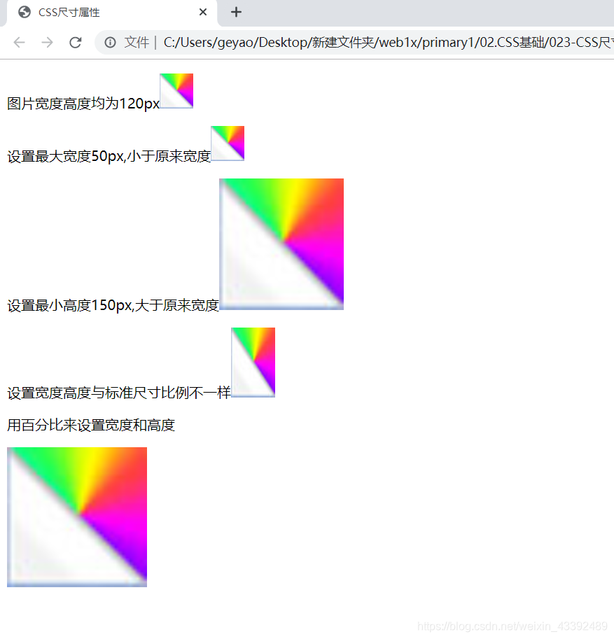 <html><head><meta http-equiv="content-type" content="text/html; charset=utf-8"><title>CSS尺寸属性</title></head><body><p>图片宽度高度均为120px<img src="./img/43.jpg" /></p><p>设置最大宽度50px,小于原来宽度<img src="./img/43.jpg" style= "max-width: 50px;" /></p><p>设置最小高度150px,大于原来宽度<img src="./img/43.jpg" style= "min-height: 150px;" /></p><p>设置宽度高度与标准尺寸比例不一样<img src="./img/43.jpg" style= "width: 50px; height: 80px;" /></p><p>用百分比来设置宽度和高度<div style="width: 200px;height: 200px;"><img src="./img/43.jpg" style="width: 80%; height: 80%;" /></div></p></body>
