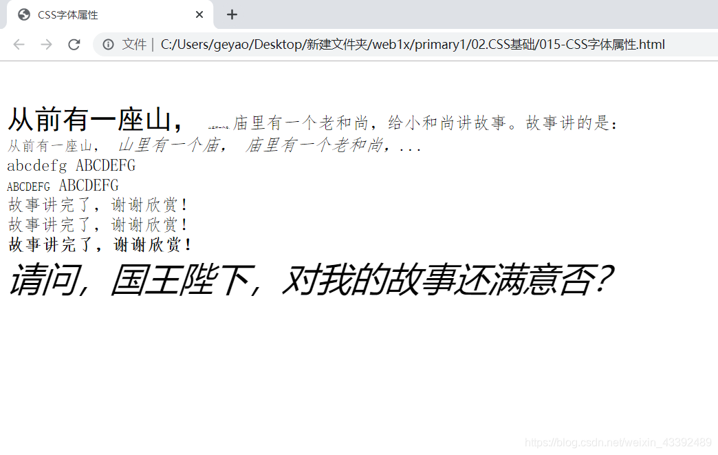 <html><head><meta http-equiv="content-type" content="text/html; charset=utf-8"><title>CSS字体属性</title></head><body><p style="font-family: FangSong;font-size: 20px;"><span style="font-family:SimHei;font-size: xx-large;">从前有一座山,</span><span style="font-family: LiSu,KaiTi;font-size: 20%;">山里有一个庙,</span>庙里有一个老和尚,给小和尚讲故事。故事讲的是:<br /><span style="font-size: smaller;">从前有一座山,</span><span style="font-style: oblique;">山里有一个庙,</span><span style="font-style: italic;">庙里有一个老和尚,</span>...<br /><span>abcdefg ABCDEFG</span><br /><span style="font-variant: small-caps;">abcdefg ABCDEFG</span> <br /><span>故事讲完了,谢谢欣赏!</span><br /><span style="font-weight: 200;">故事讲完了,谢谢欣赏!</span><br /><span style="font-weight: bold;">故事讲完了,谢谢欣赏!</span><br /><span style="font:italic 40px blod SimHei;">请问,国王陛下,对我的故事还满意否?</span></p></body>