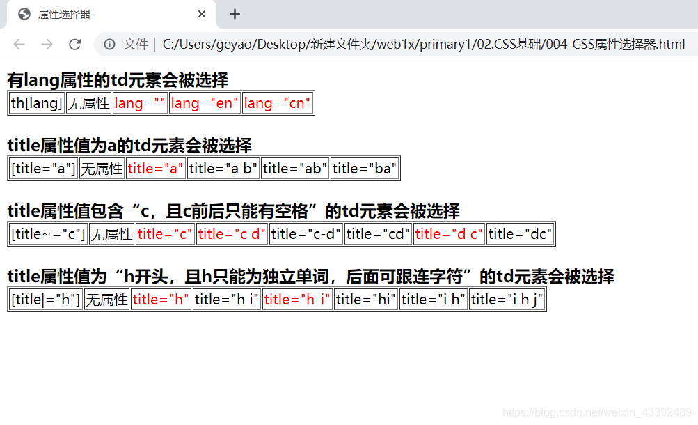 <html><head><meta http-equiv="content-type" content="text/html; charset=utf-8"><title>属性选择器</title><style type="text/css">td[lang] {color: red;}td[title="a"] {color: red;}td[title~="c"] {color: red;}td[title|="h"] {color: red;}</style></head><body><big><b>有lang属性的td元素会被选择</b></big><table border="1"><tr><td>th[lang]</td><td>无属性</td><td lang="">lang=""</td><td lang="en">lang="en"</td><td lang="cn">lang="cn"</td></tr></table><br /><big><b>title属性值为a的td元素会被选择</b></big><table border="1"><tr><td>[title="a"]</td><td>无属性</td><td title="a">title="a"</td><td title="a b">title="a b"</td><td title="ab">title="ab"</td><td title="ba">title="ba"</td></tr></table><br /><big><b>title属性值包含“c,且c前后只能有空格”的td元素会被选择</b></big><table border="1"><tr><td>[title~="c"]</td><td>无属性</td><td title="c">title="c"</td><td title="c d">title="c d"</td><td title="c-d">title="c-d"</td><td title="cd">title="cd"</td><td title="d c">title="d c"</td><td title="dc">title="dc"</td></tr></table><br /><big><b>title属性值为“h开头,且h只能为独立单词,后面可跟连字符”的td元素会被选择</b></big><table border="1"><tr><td>[title|="h"]</td><td>无属性</td><td title="h">title="h"</td><td title="h i">title="h i"</td><td title="h-i">title="h-i"</td><td title="hi">title="hi"</td><td title="i h">title="i h"</td><td title="i h j">title="i h j"</td></tr></table></body>
