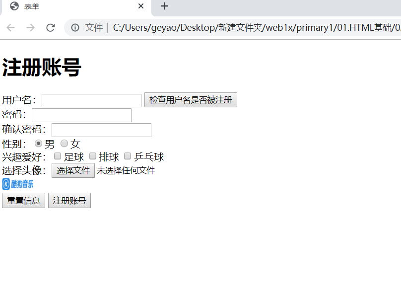 <html><head><meta http-equiv="content-type" content="text/html; charset=utf-8"><title>表单</title></head><body><h1>注册账号</h1><form action="regist" method="post">用户名:<input type="text" name="username" id="username" value="" /><input type="button" name="checkusername" id="checkusername" value="检查用户名是否被注册" /><br />密码:<input type="password" name="password" id="password" value="" /> <br />确认密码:<input type="password" name="" id="re_password" value="" /> <br />性别:<input type="radio" name="sex" id="sex_man" value="man" checked="checked" />男 <input type="radio" name="sex" id="sex_woman"value="woman" />女<br />兴趣爱好:<input type="checkbox" name="interest" id="ins_football" value="football" />足球 <input type="checkbox" name="interest"id="ins_volleyball" value="volleyball" />排球 <input type="checkbox" name="interest" id="ins_ping-pong" value="ping-pong" />乒乓球<br />选择头像:<input type="file" name="file" id="file" value="" /><br /><input type="image" width="80" height="80" src="pic/submit.jpg" alt="我是歌谣"/> <br /><input type="reset" value="重置信息" /> <input type="submit" id="submit" value="注册账号" /><input type="hidden" name="regist" id="" value="default" /></form></body>
